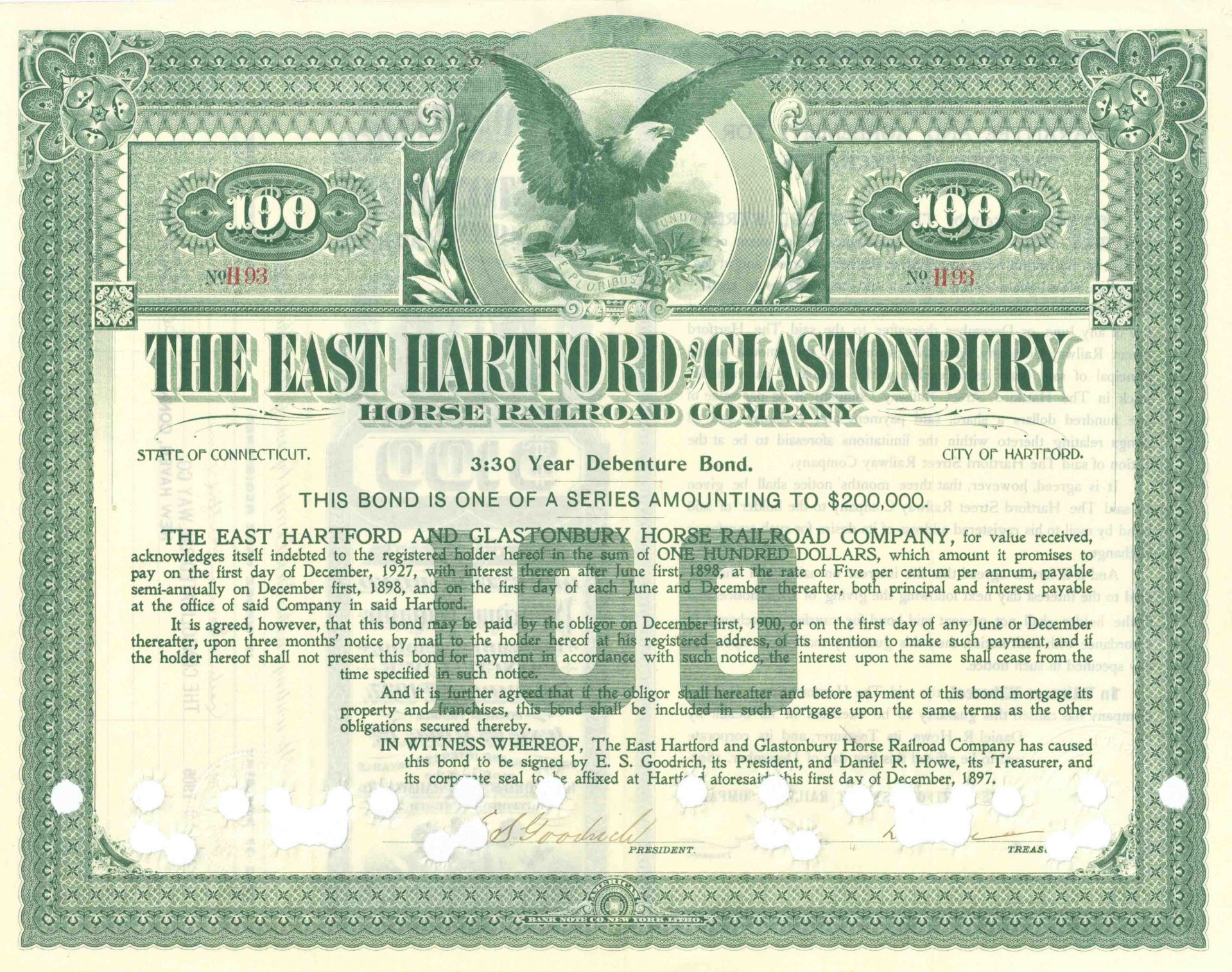 East Hartford and Glastonbury Horse Railroad - Connecticut 5% Horse Railway Bond
