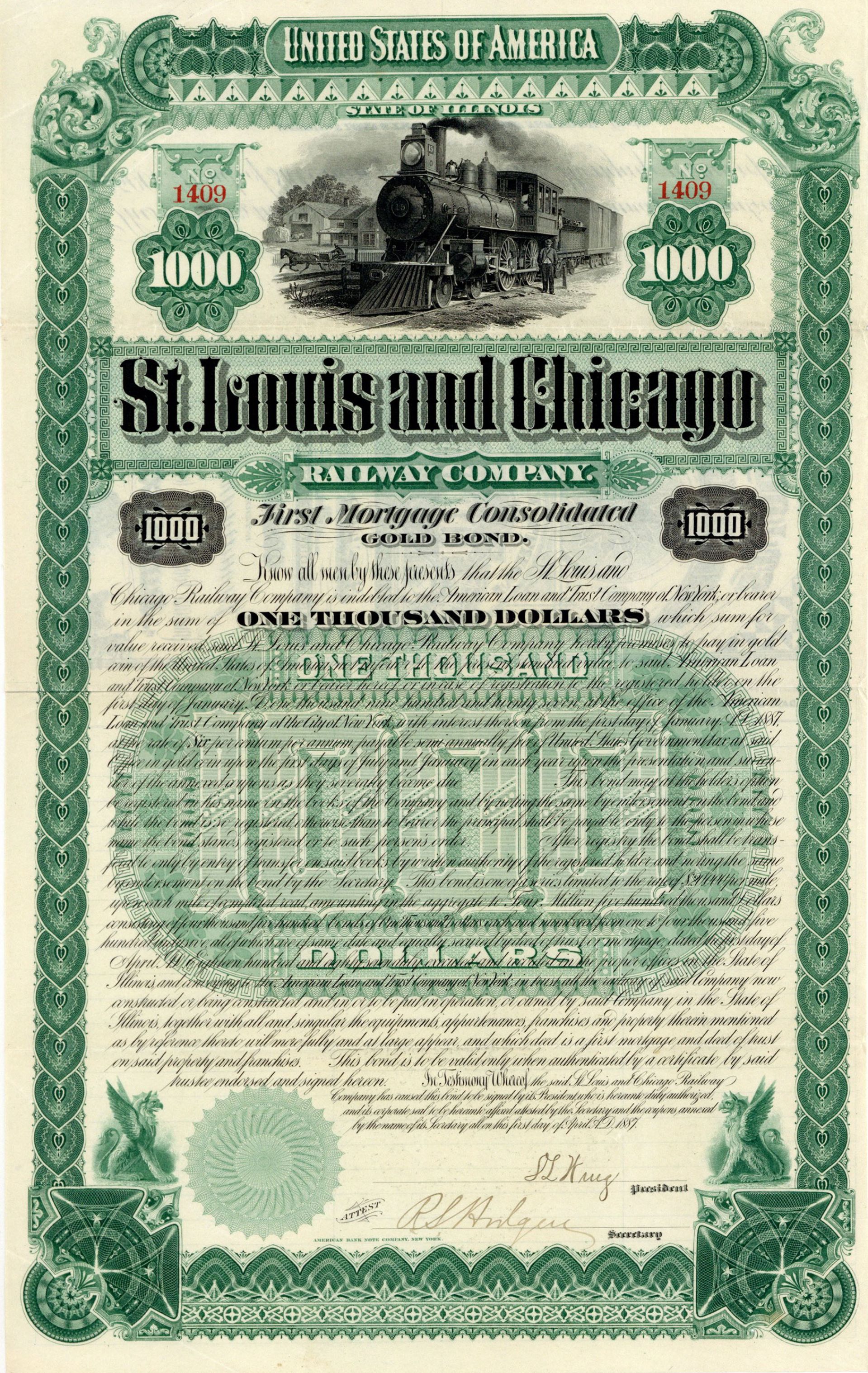 St. Louis and Chicago Railway - 1887 dated $1,000 Railroad Gold Bond