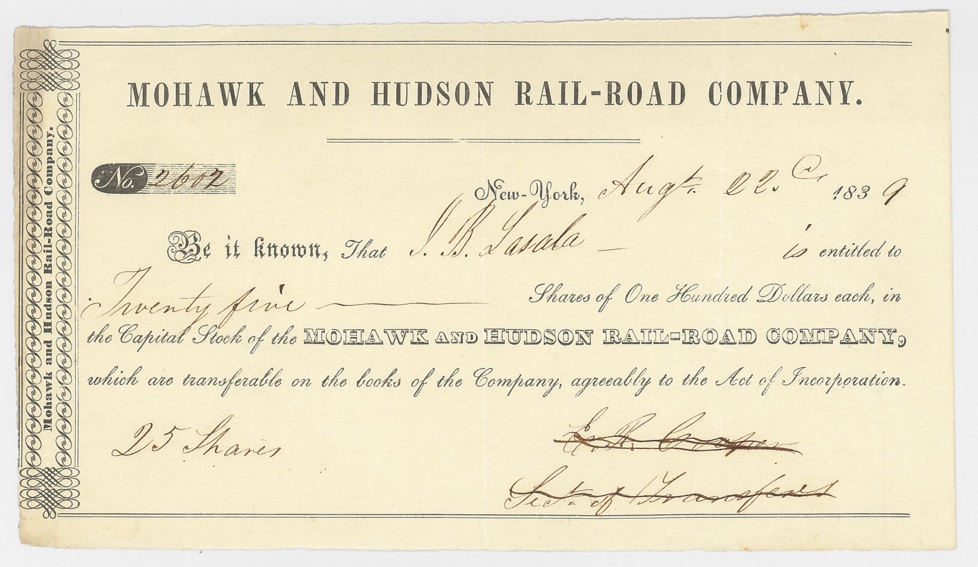 Mohawk and Hudson Rail-Road Co. - Very Early - 1839 dated Railway Stock Certificate - First Railroad in the State of New York