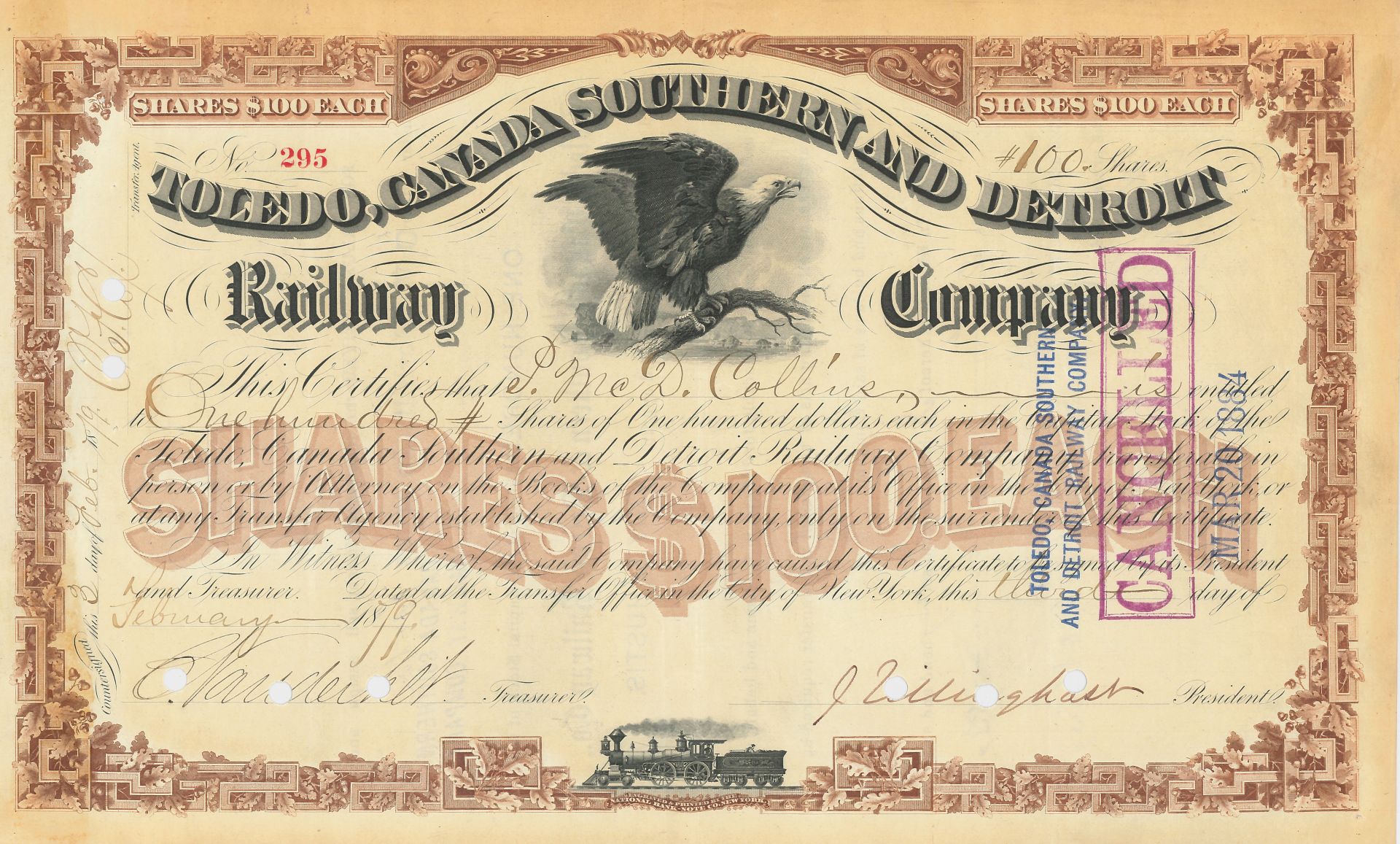Toledo, Canada Southern and Detroit Railway Co. signed by Cornelius Vanderbilt (Jr.) - 1879 dated Autographed Stock Certificate