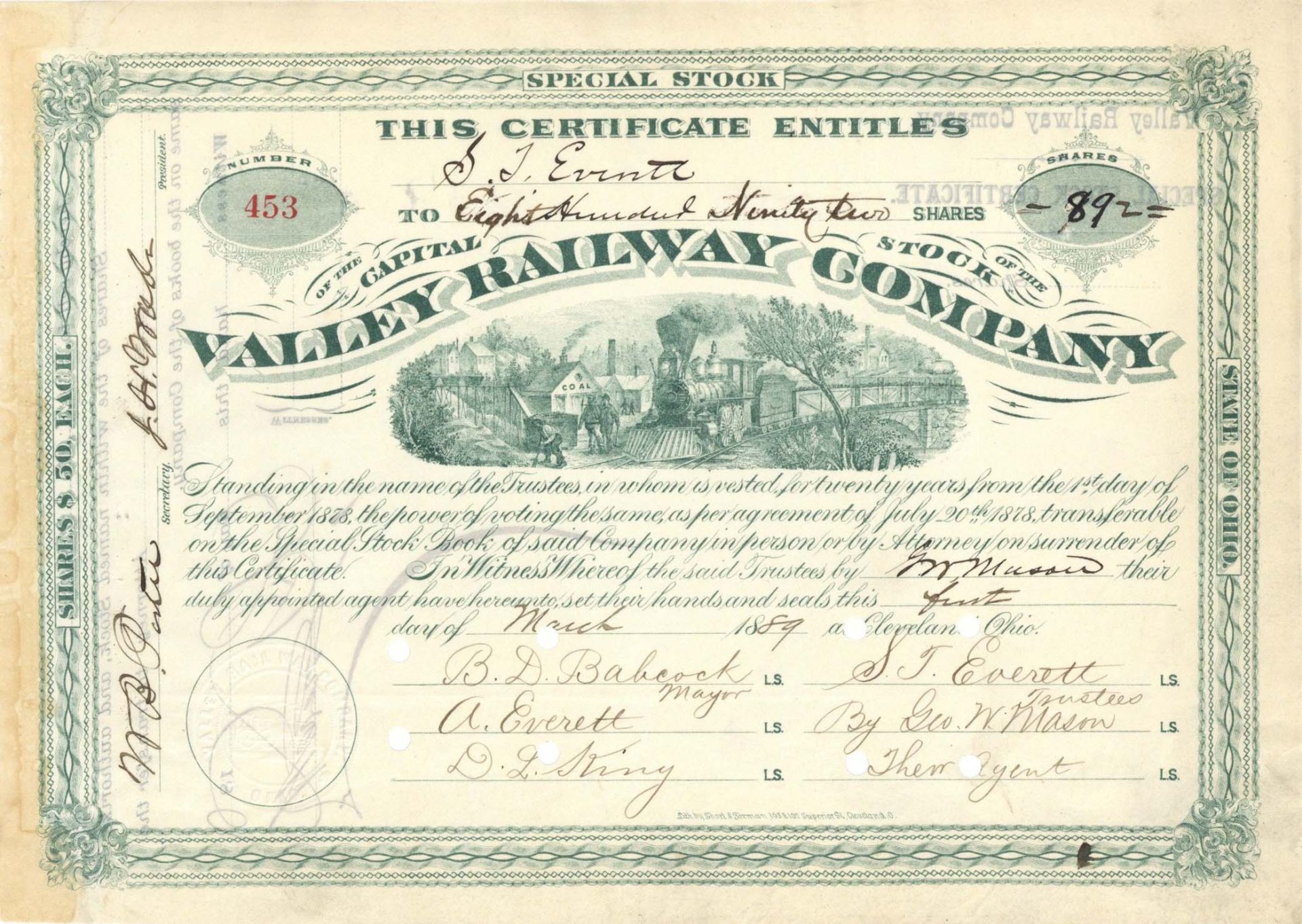Valley Railway Co. signed by Jeptha H Wade - 1889 dated Autographed Stock Certificate