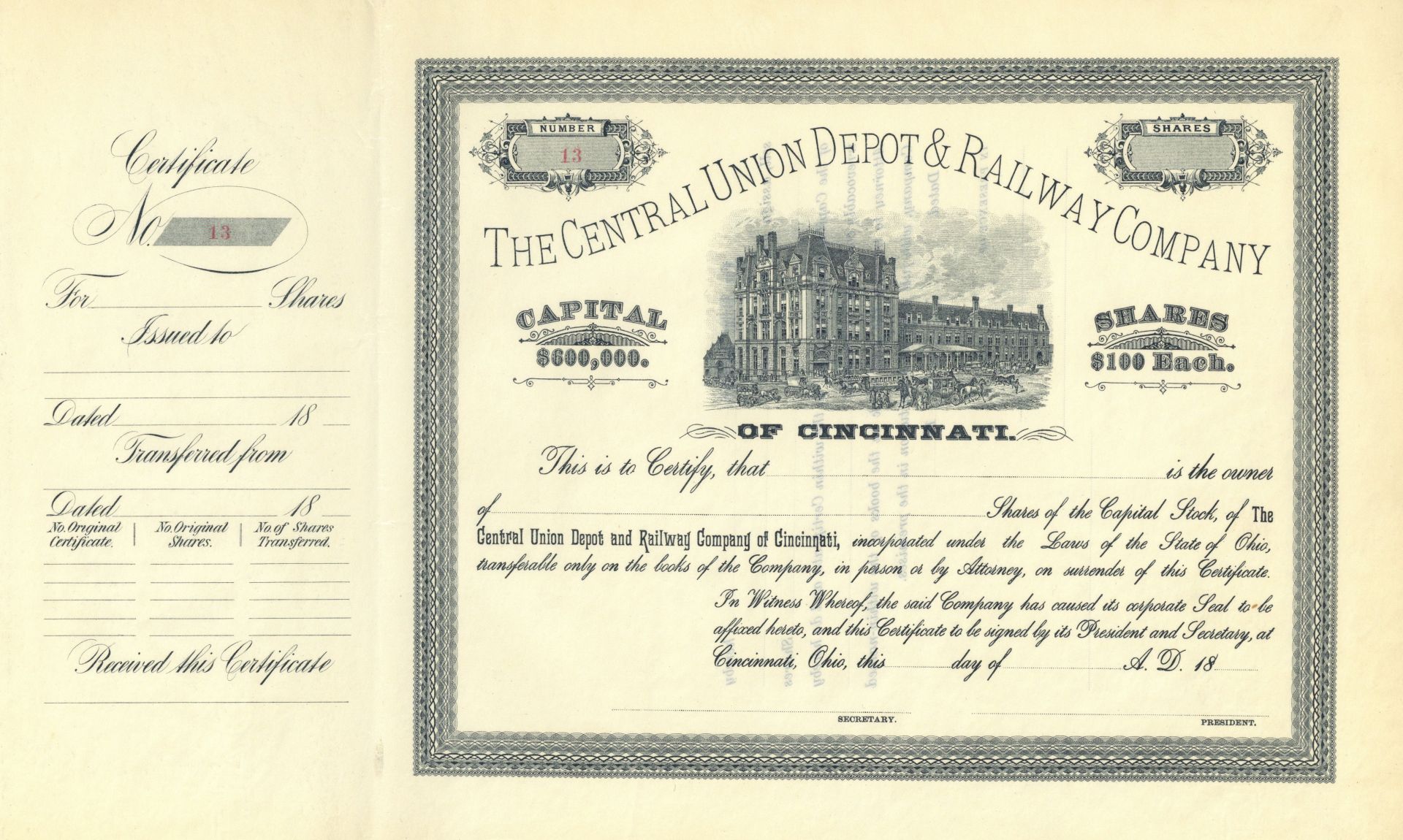 Central Union Depot and Railway Co. - circa 1890's Unissued Railroad Stock Certificate