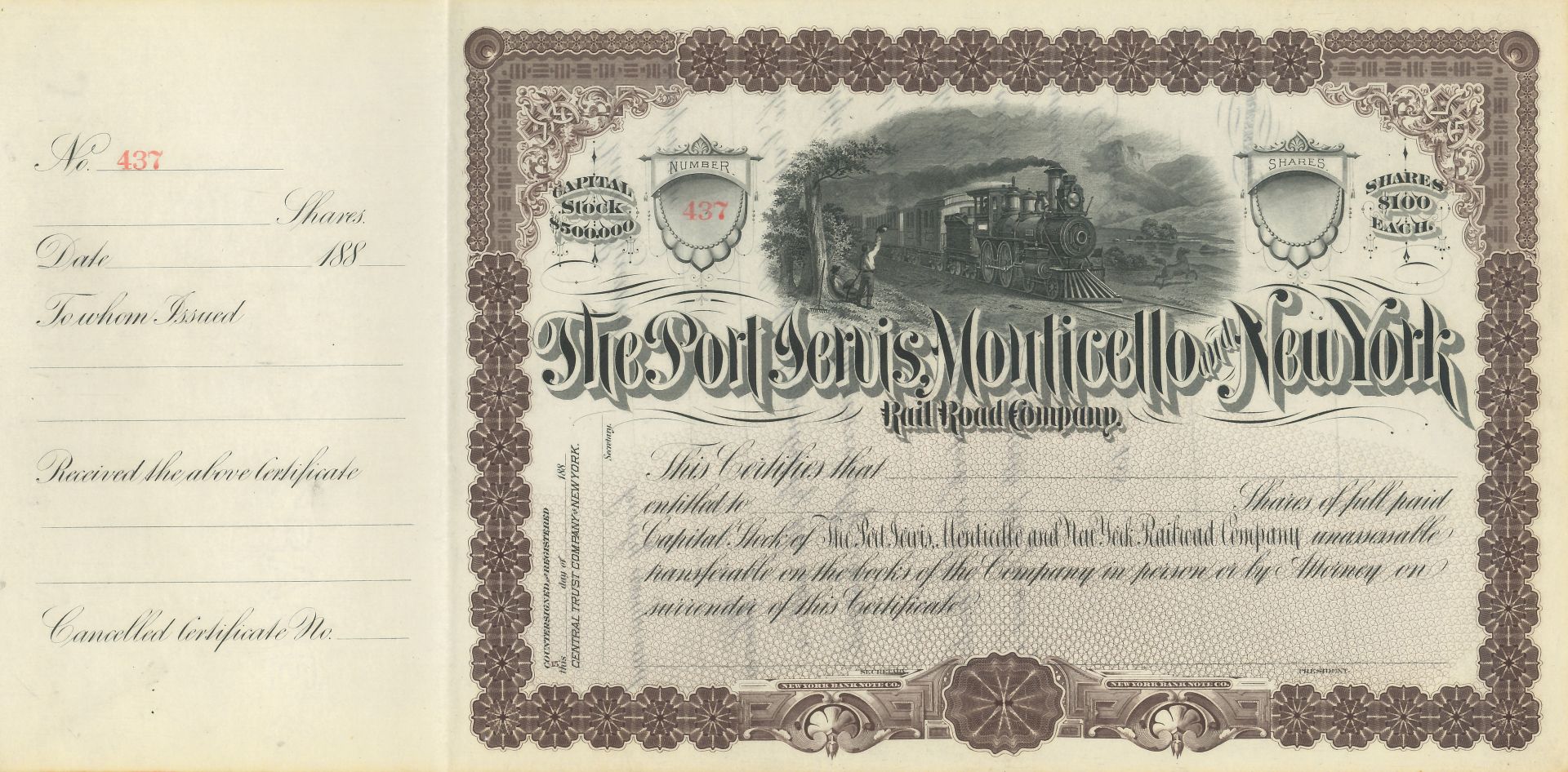 Port Jervis, Monticello and New York Railroad Co. - 1880's dated Unissued Railway Stock Certificate - Cut Cancel with Tape As Usual