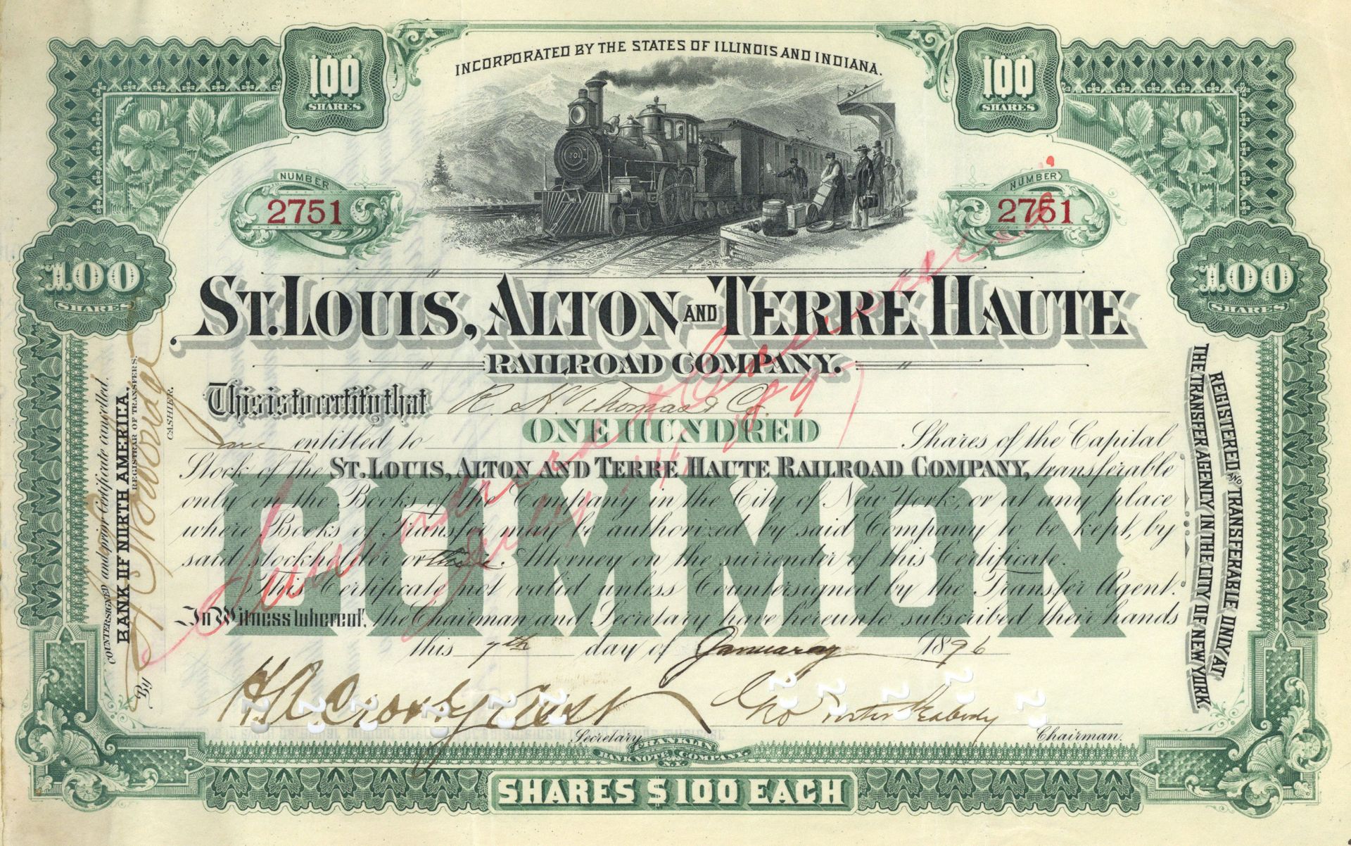 St Louis, Alton and Terre Haute Railroad - Signed by George Foster Peabody - 1890's dated Autograph Railway Stock Certificate