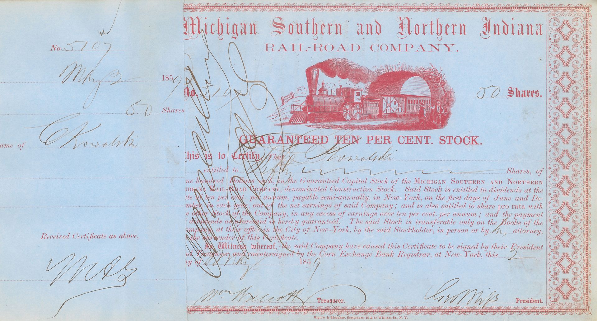 Michigan Southern and Northern Indiana Railroad Co. - 1850's-60's dated Railway Stock Certificate