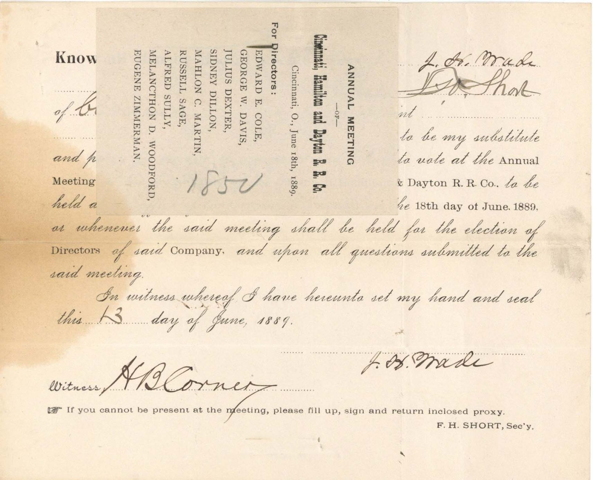 Inv# AG2241 AutographPower of Attorney for the annual meeting of the Cincinnati, Hamilton and Dayton Railroad Company signed by J. H. Wade. List of directors pinned to front.