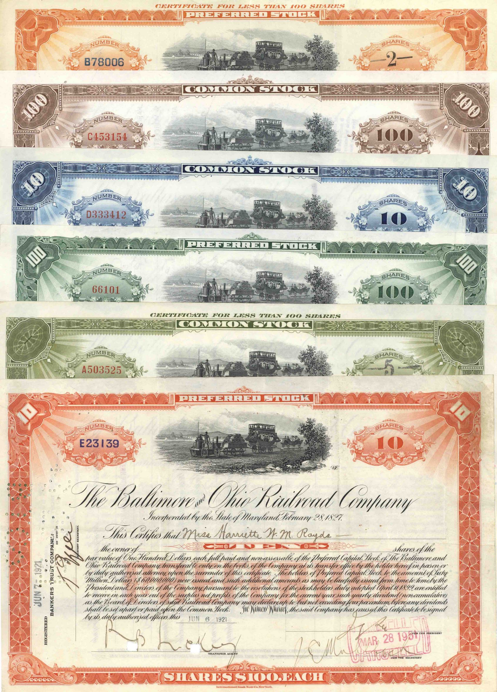 Collection of 6 Different Color Stocks - Baltimore and Ohio Railroad Collection of Six Stock Certificates