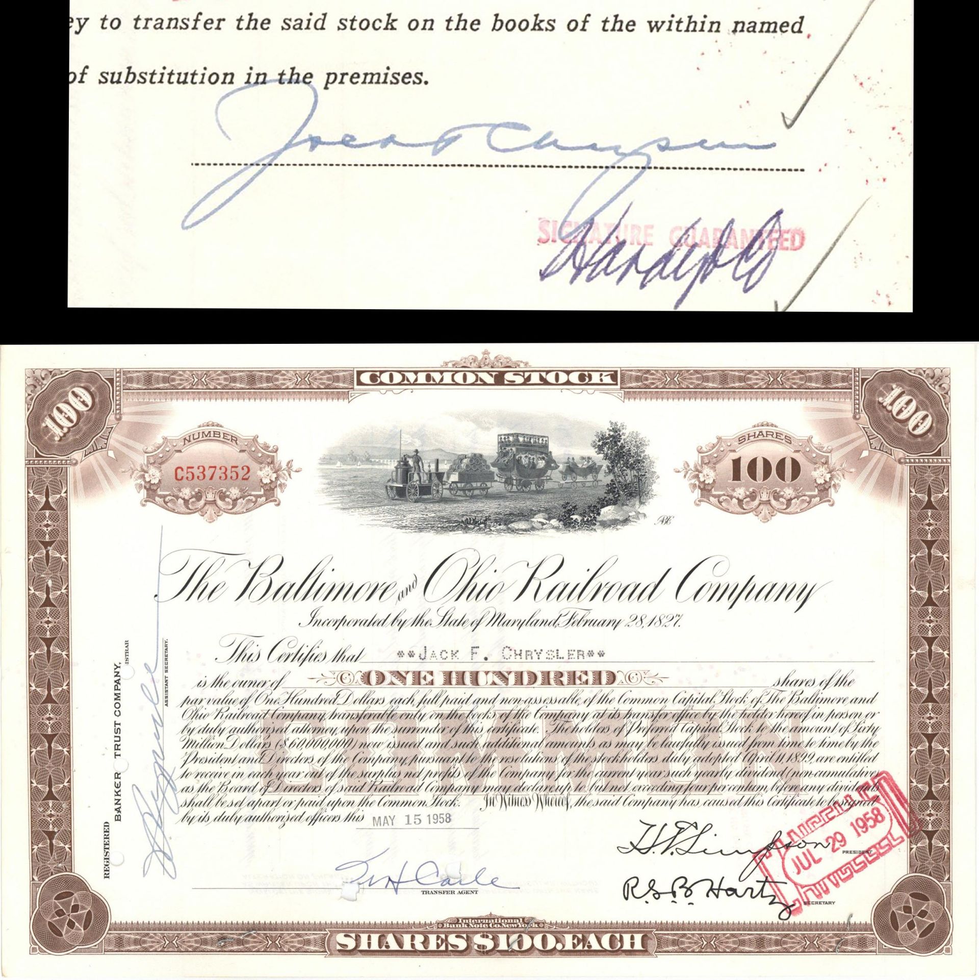 Baltimore and Ohio Railroad Co. Signed by Jack F. Chrysler - 1958 dated Autographed Stock Certificate