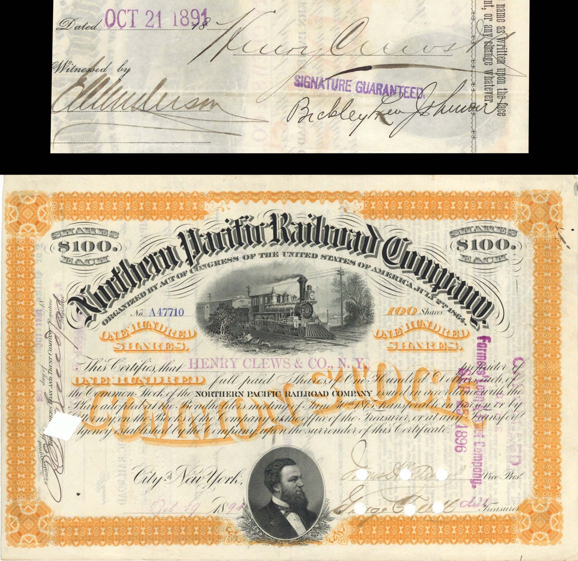 Northern Pacific Railroad Co. Issued to Henry Clews and Co., N.Y. and signed by Henry Clews - 1886, 1891 or 1892 dated Autographed Stock Certificate