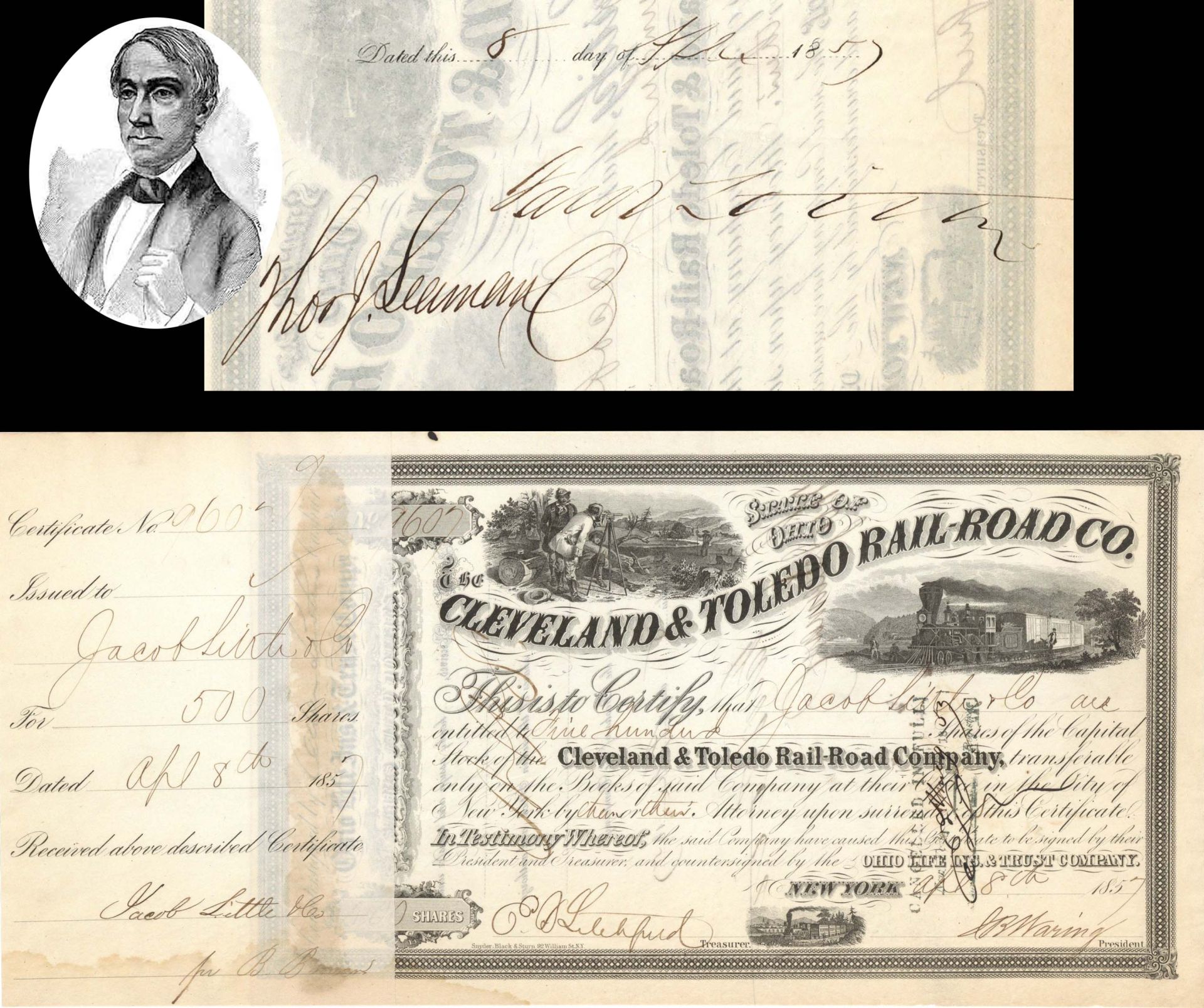 Cleveland and Toledo Rail-Road Co. issued to Jacob Little and Co. and signed by Jacob Little on back - 1857 or 1858 dated Autographed Stock Certificate