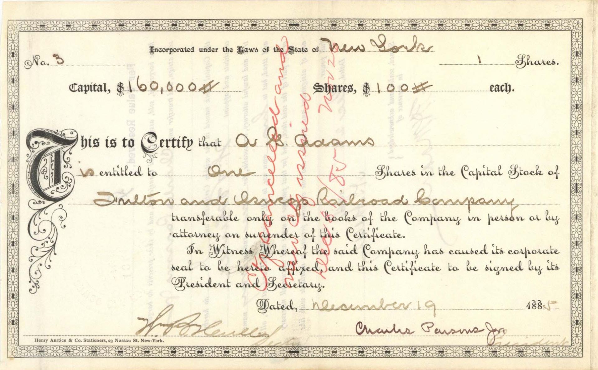 Fulton and Oswego Railroad Co. signed by Charles Parsons Jr. - 1885 dated Autograph Stock Certificate
