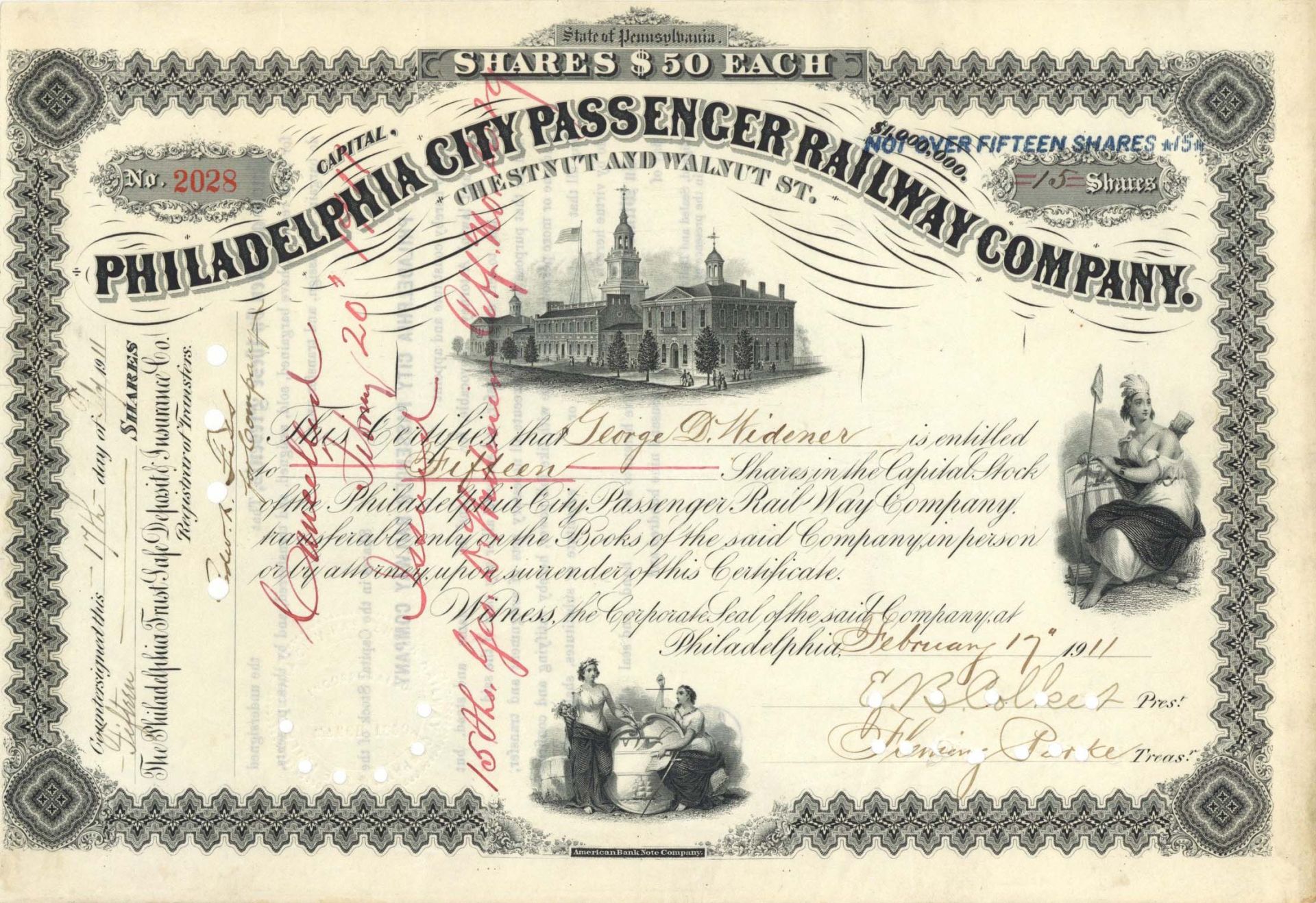 Philadelphia City Passenger Railway Co. issued to George D. Widener - not signed - Died on the Titanic - 1911 dated Stock Certificate
