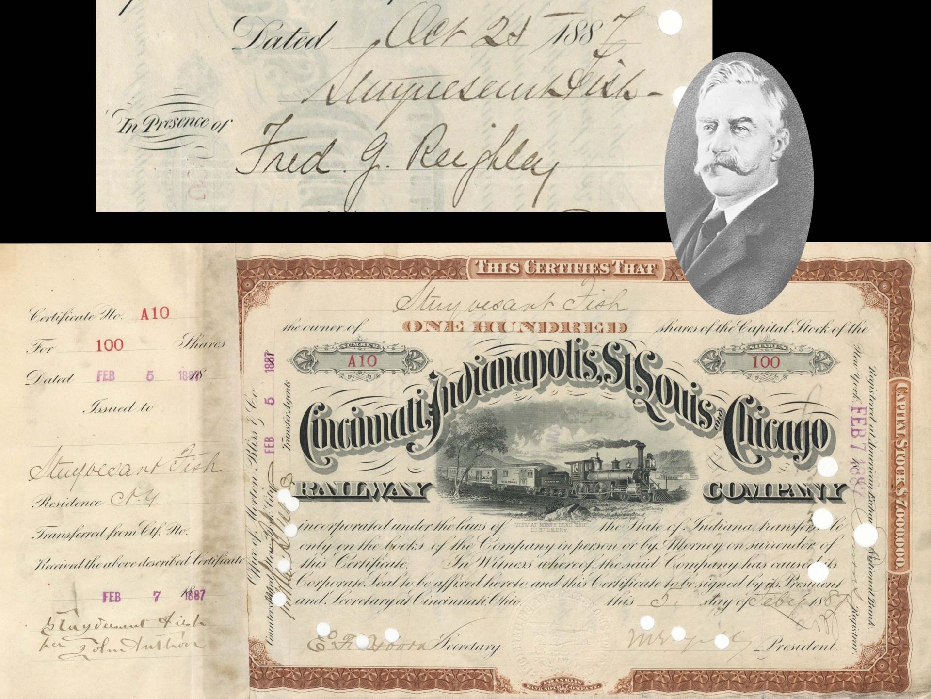 Cincinnati, Indianapolis, St. Louis and Chicago Railway Co. Issued to and signed by Stuyvesant Fish - 1887 dated Autograph Railway Stock Certificate