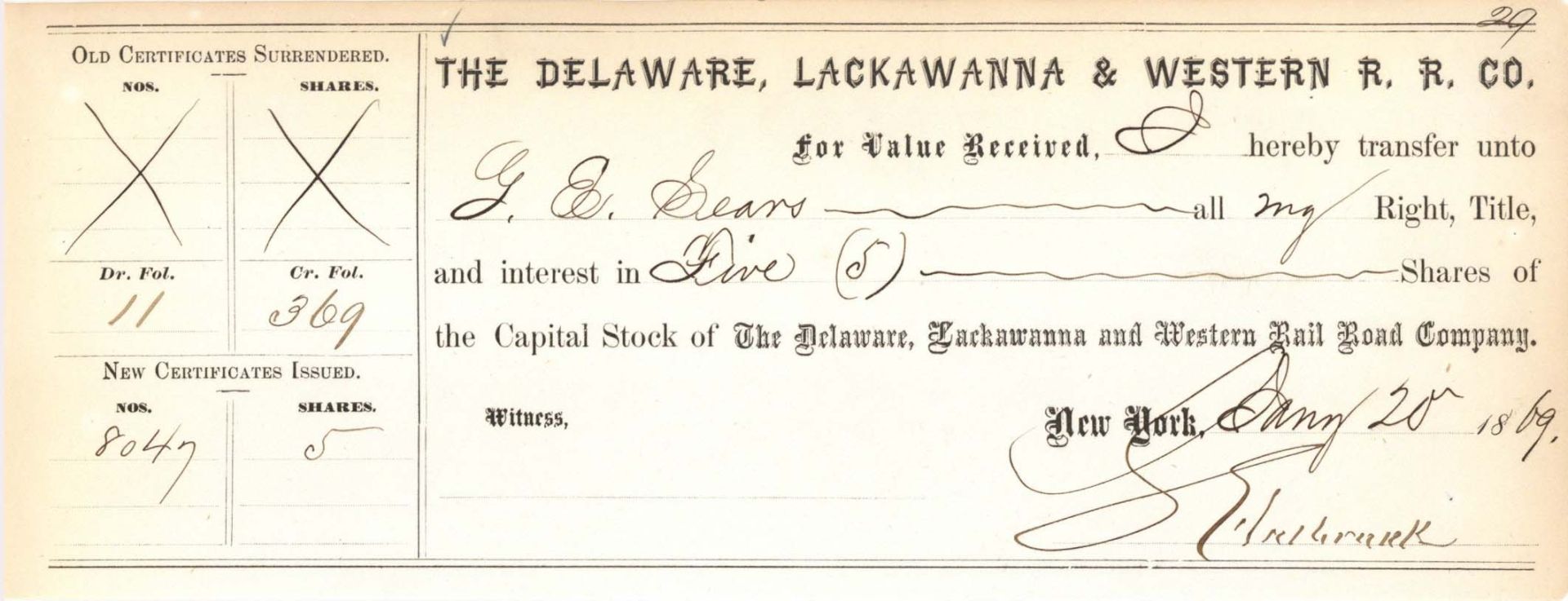 Delaware, Lackawanna and Western R. R. Co. - 1869 or 1870 dated Stock Certificate
