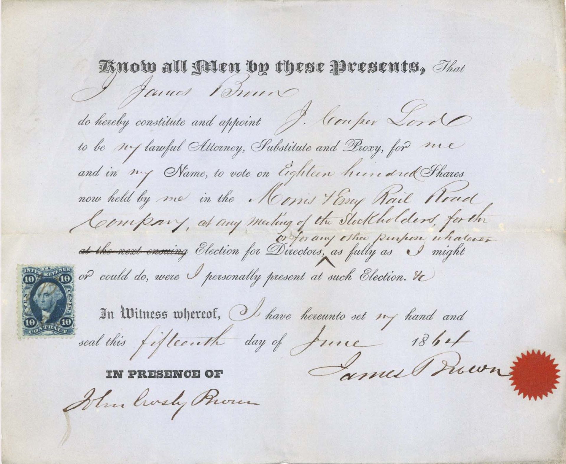 Attorney appointment Sheet for Morris & Essex Rail Road Co. stock with 10 cents Washington revenue stamp.