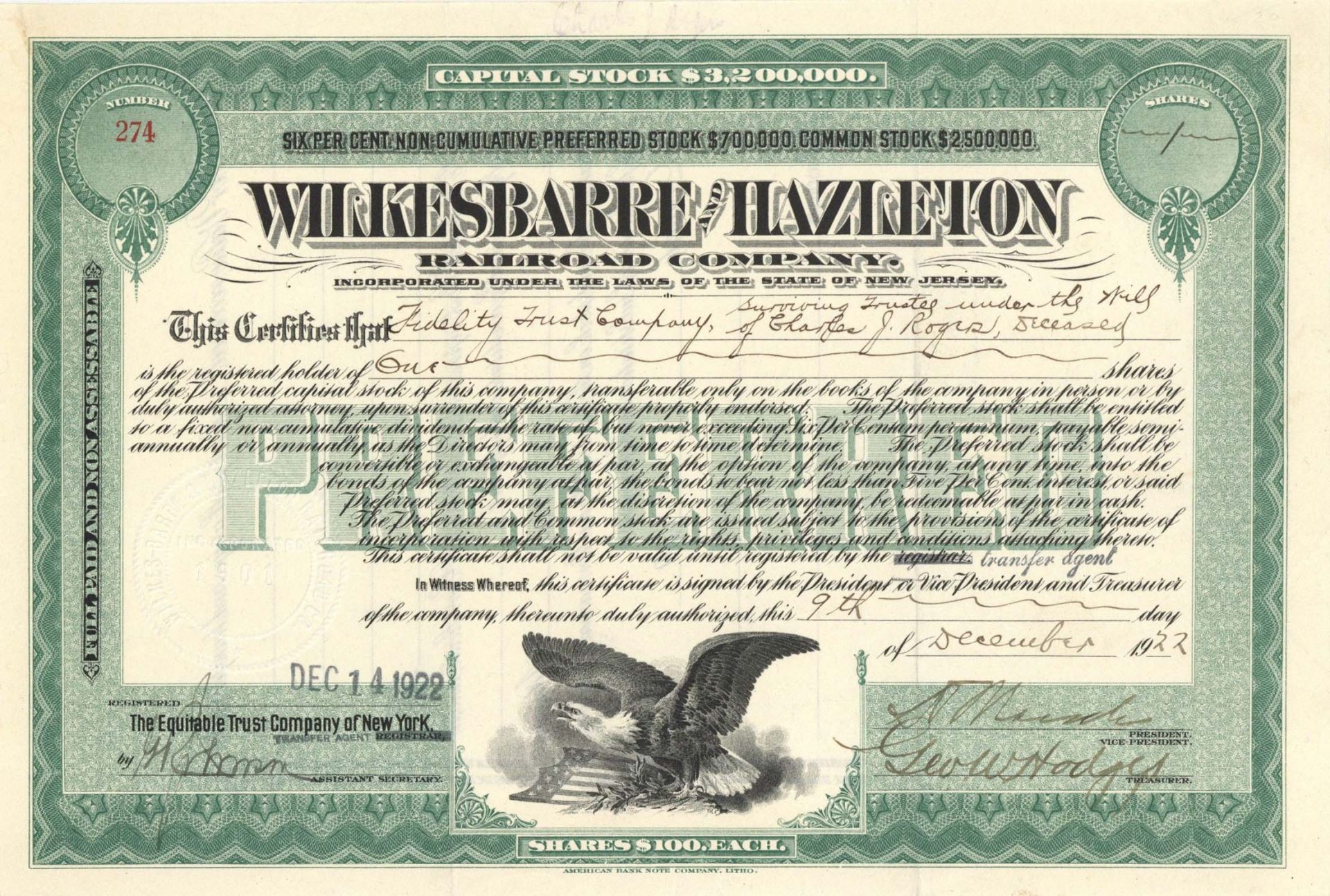 new Wilkesbarre and Hazleton Railroad Co. - 1922 dated Stock Certificate