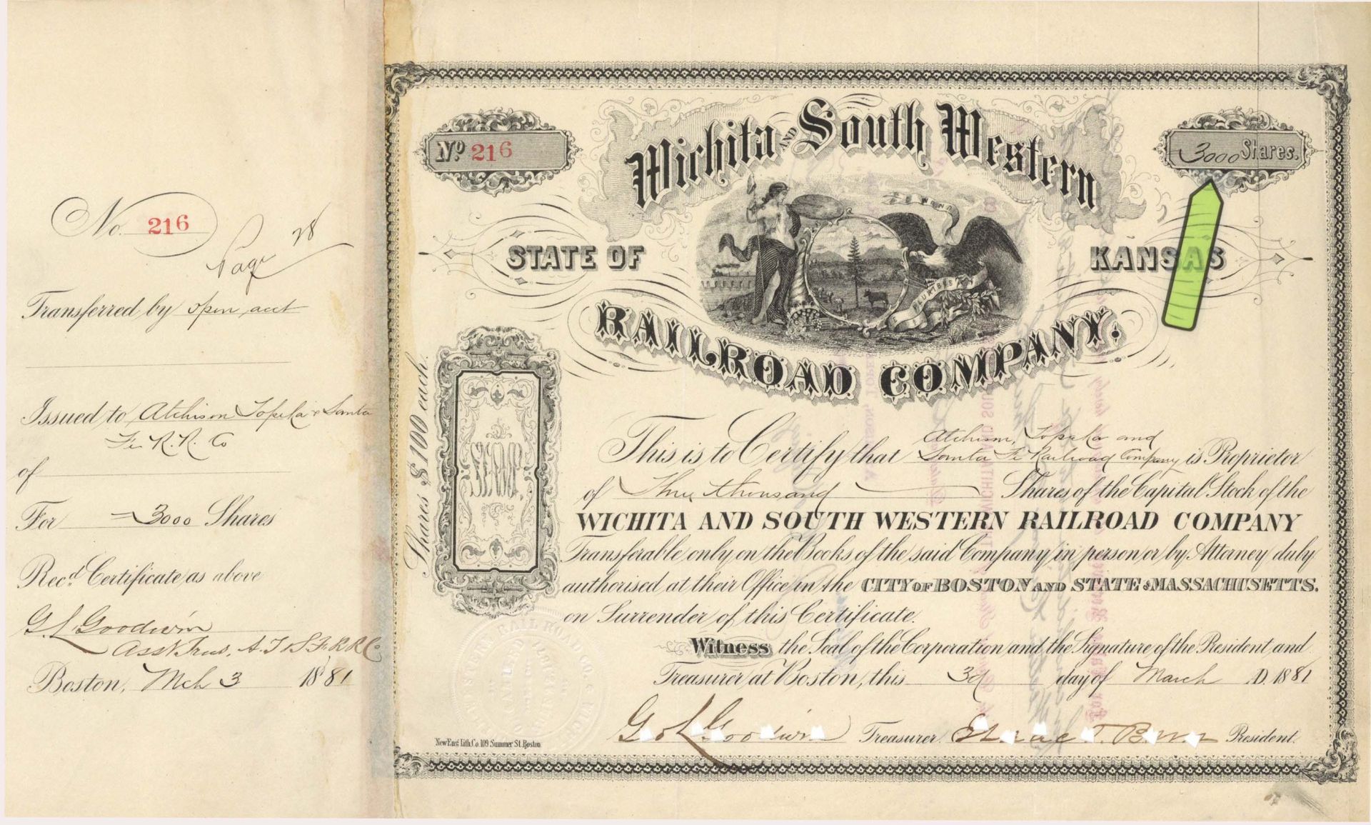 Wichita and South Western Railroad Co. - 1881 dated High Denomination Stock Certificate