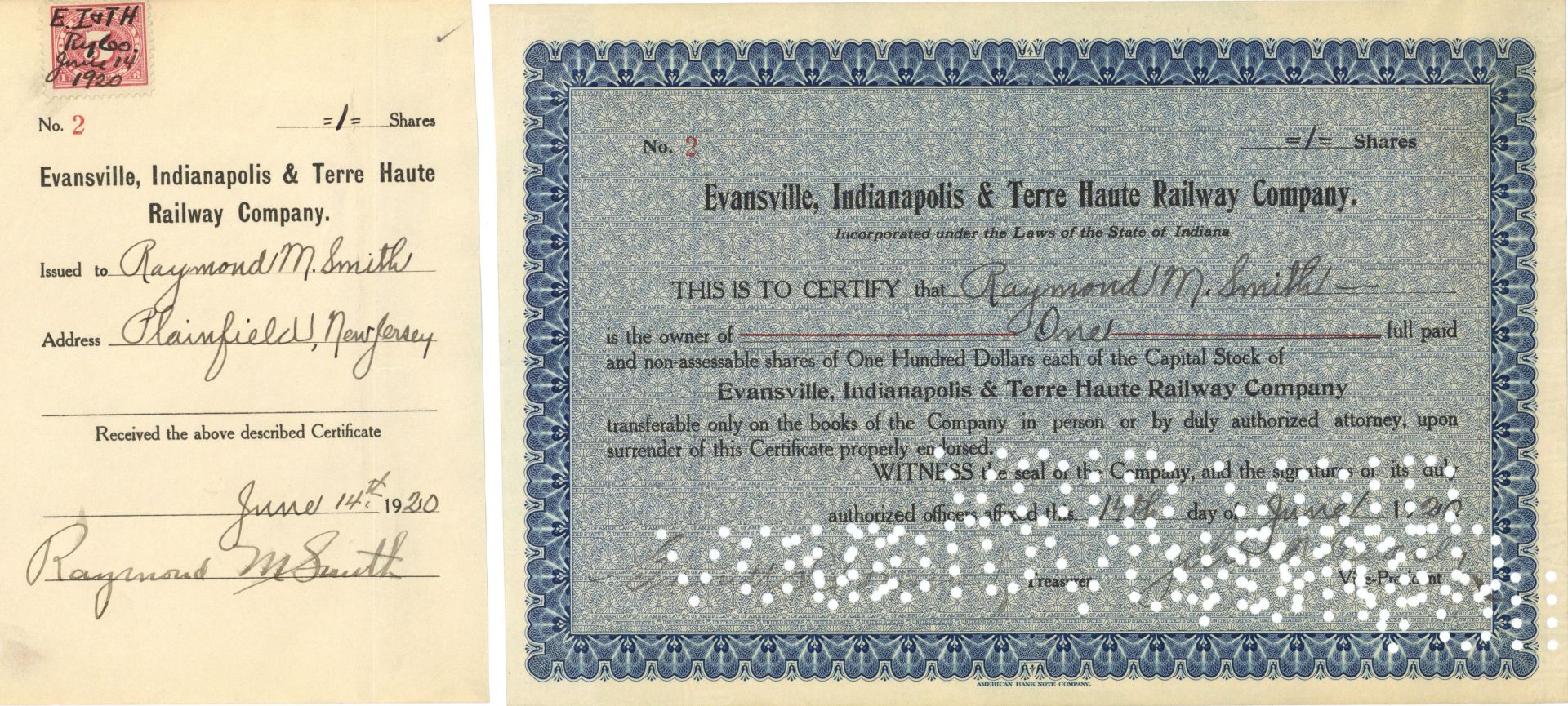 Evansville, Indianapolis and Terre Haute Railway Co. - 1932 dated Railroad Stock Certificate