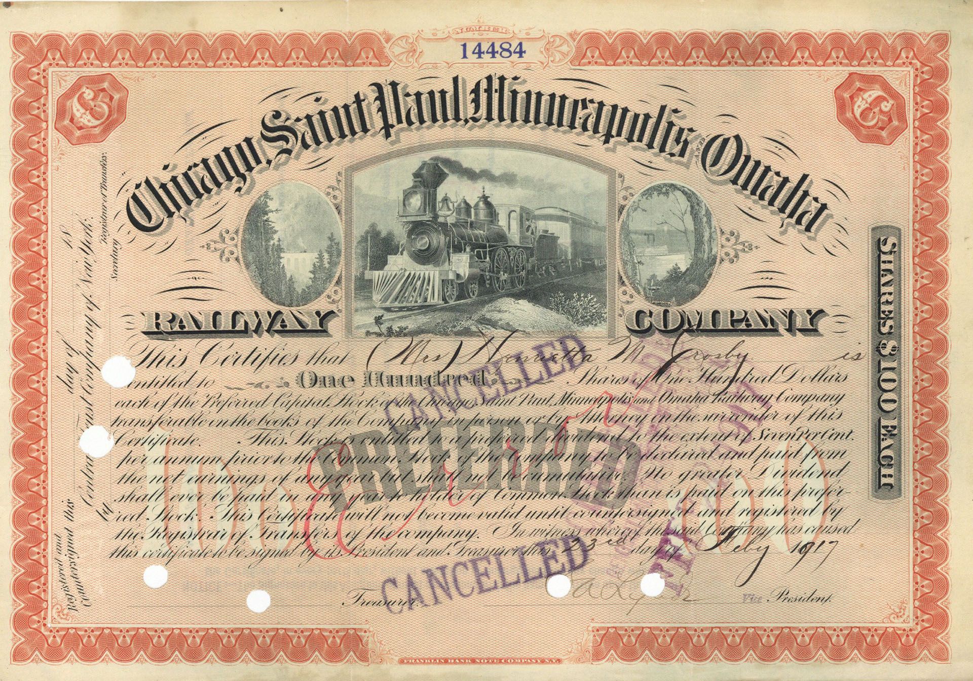 Chicago, Saint Paul, Minneapolis and Omaha Railway Co. - 1917 Partially Issued Stock Certificate - Extremely Rare