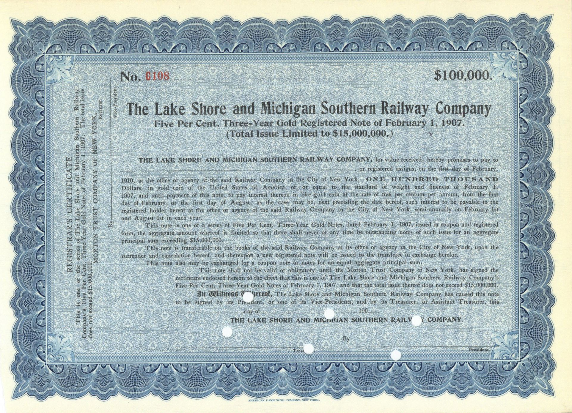 Inv# RB7484 BondUnissued $100,000, $50,000 or $5,000 5% Gold Registered Note printed by American Bank Note Company, New York.