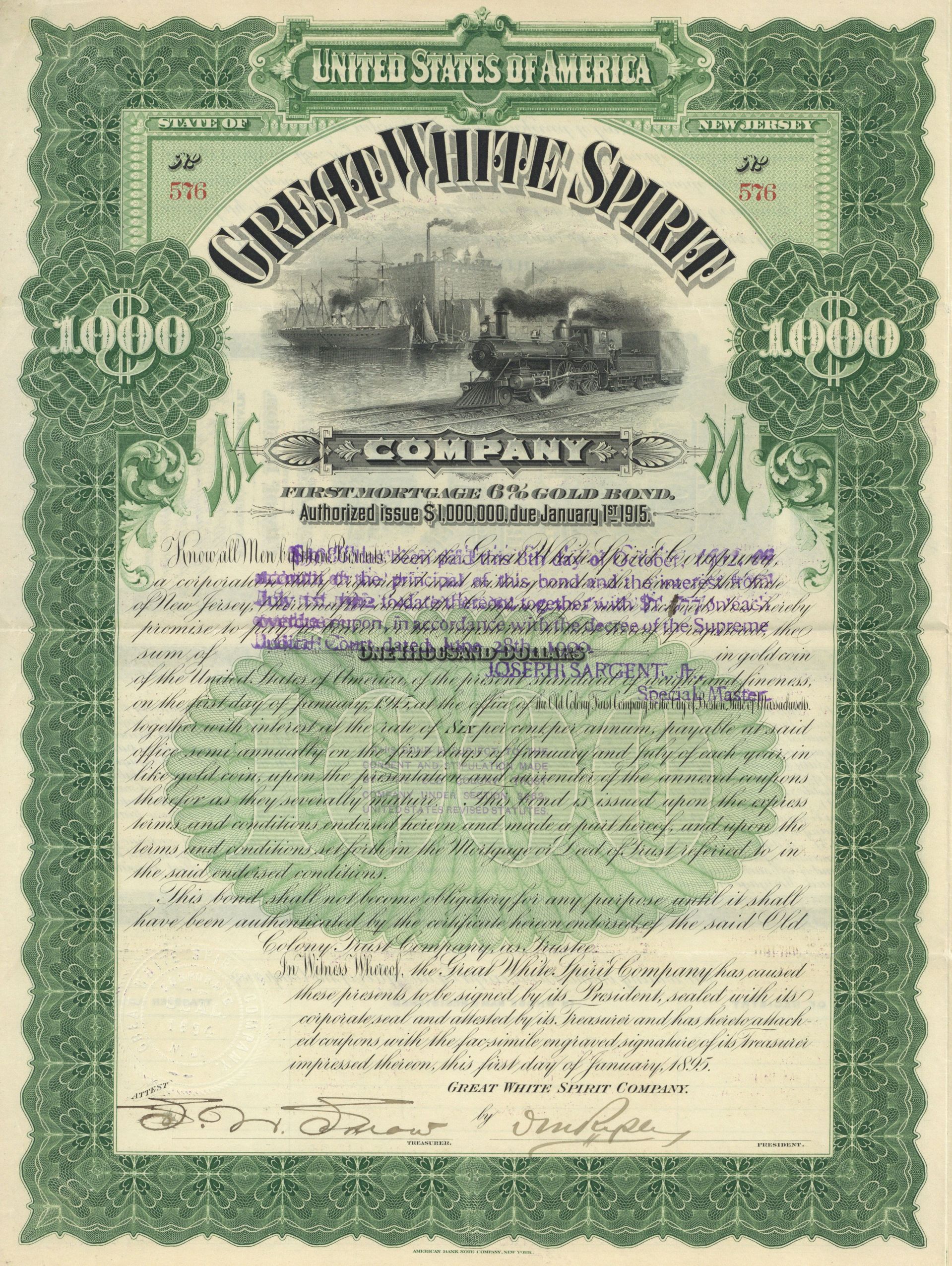 Great White Spirit Co. - 1895 dated $1,000 Shipping Gold Bond - Fantastic Design