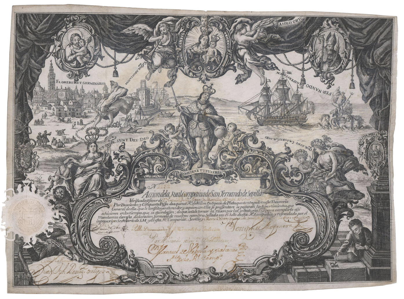 The stock certificate is profusely decorated with iconography drawn from Christianity, mythology, the New World, and from the city landscape and history of Seville itself. The most important themes on display in this engraving--religion and nationalism--emphasize the extent to which Christianity and civic pride informed the daily life of inhabitants, shareholders, and businessmen in 18th century Seville.