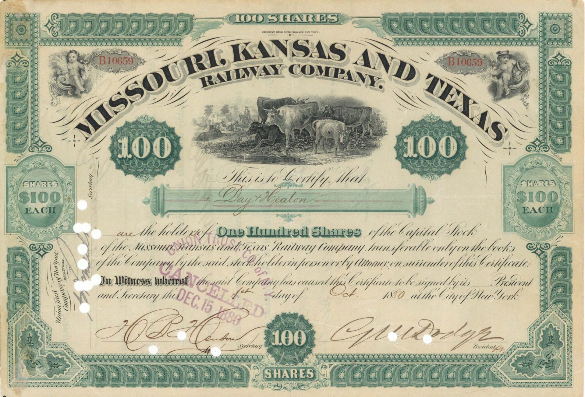 Missouri, Kansas and Texas Railway Co. signed by G. M. Dodge - 1880 dated Autographed Railroad Stock Certificate - The Katy