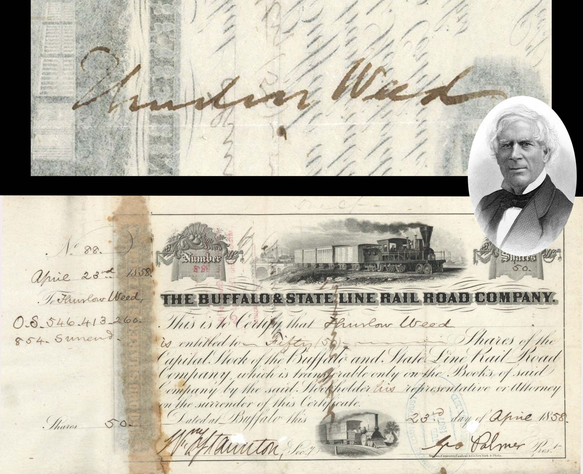 Buffalo and State Line Rail Road Co. signed by Thurlow Weed- 1858 dated Autographed Stock Certificate