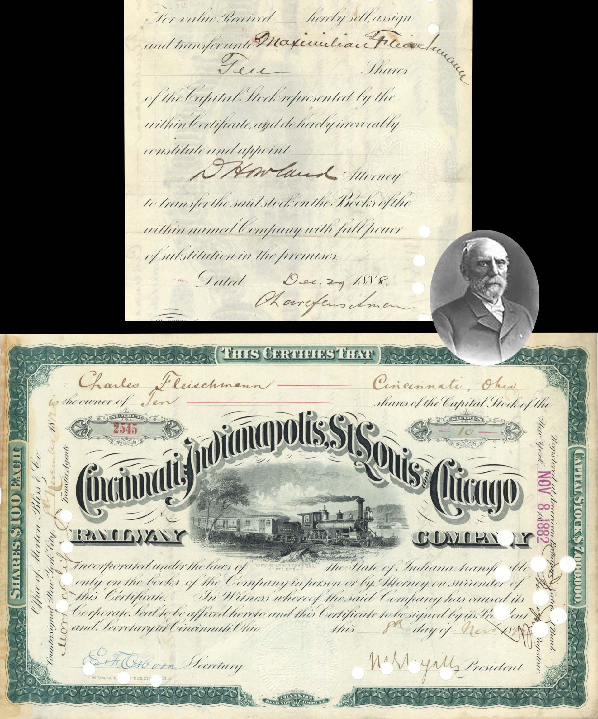 Cincinnati, Indianapolis, St. Louis and Chicago Railway Co. Issued to and Signed by Charles Fleischmann - 1882 dated Autographed Stock Certificate