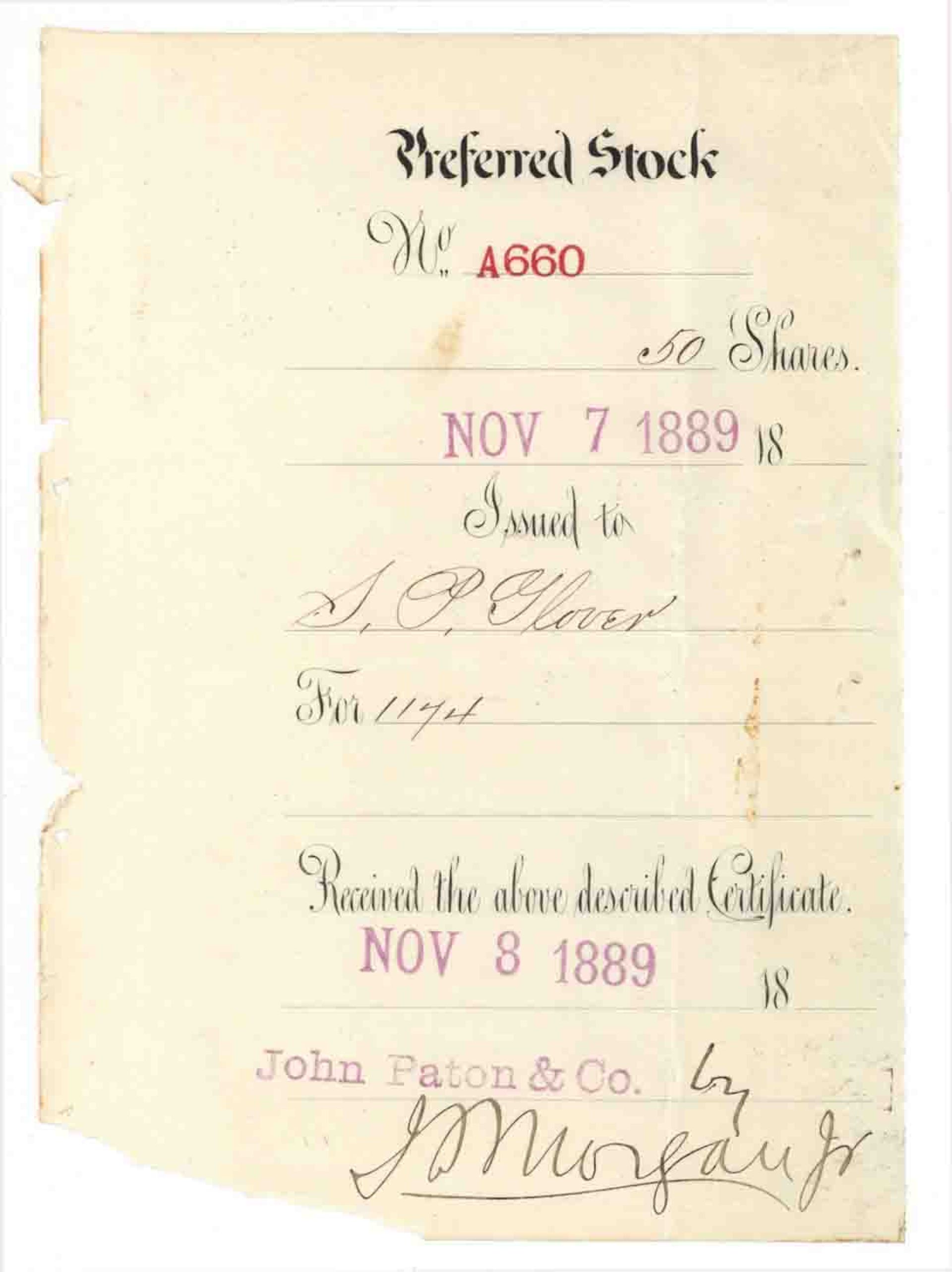 Stock Stub signed by J. Pierpont Morgan, Jr. - 1889 dated Autographed Stock Stub