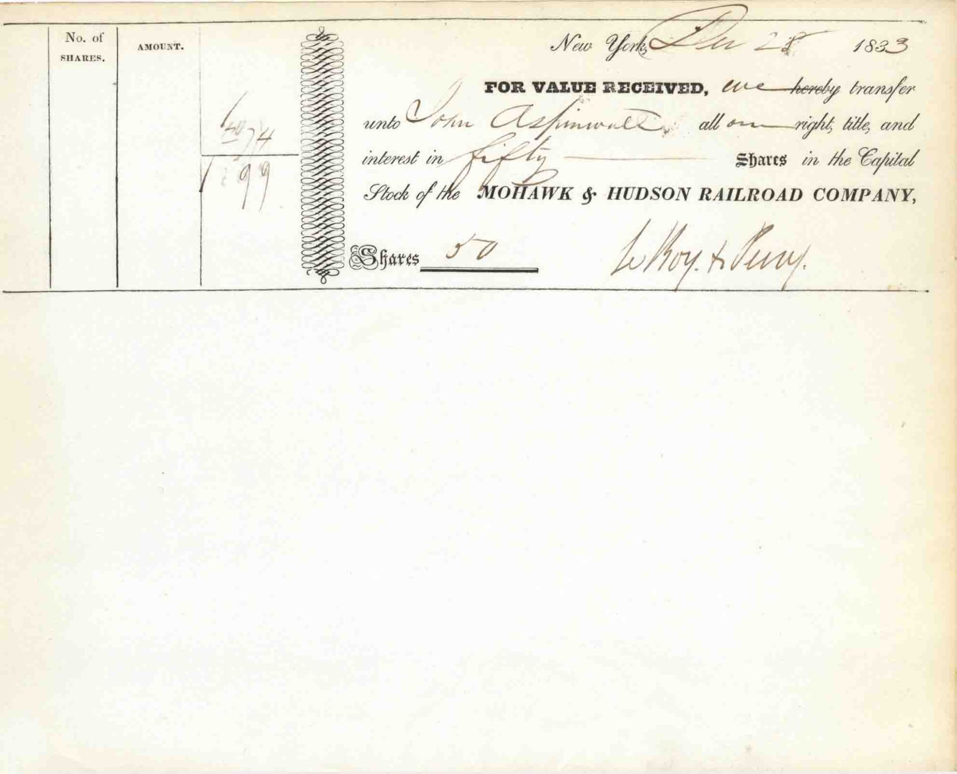 Mohawk and Hudson Railroad Co. issued to John Aspinwall - 1833 or 1835 dated Stock Certificate