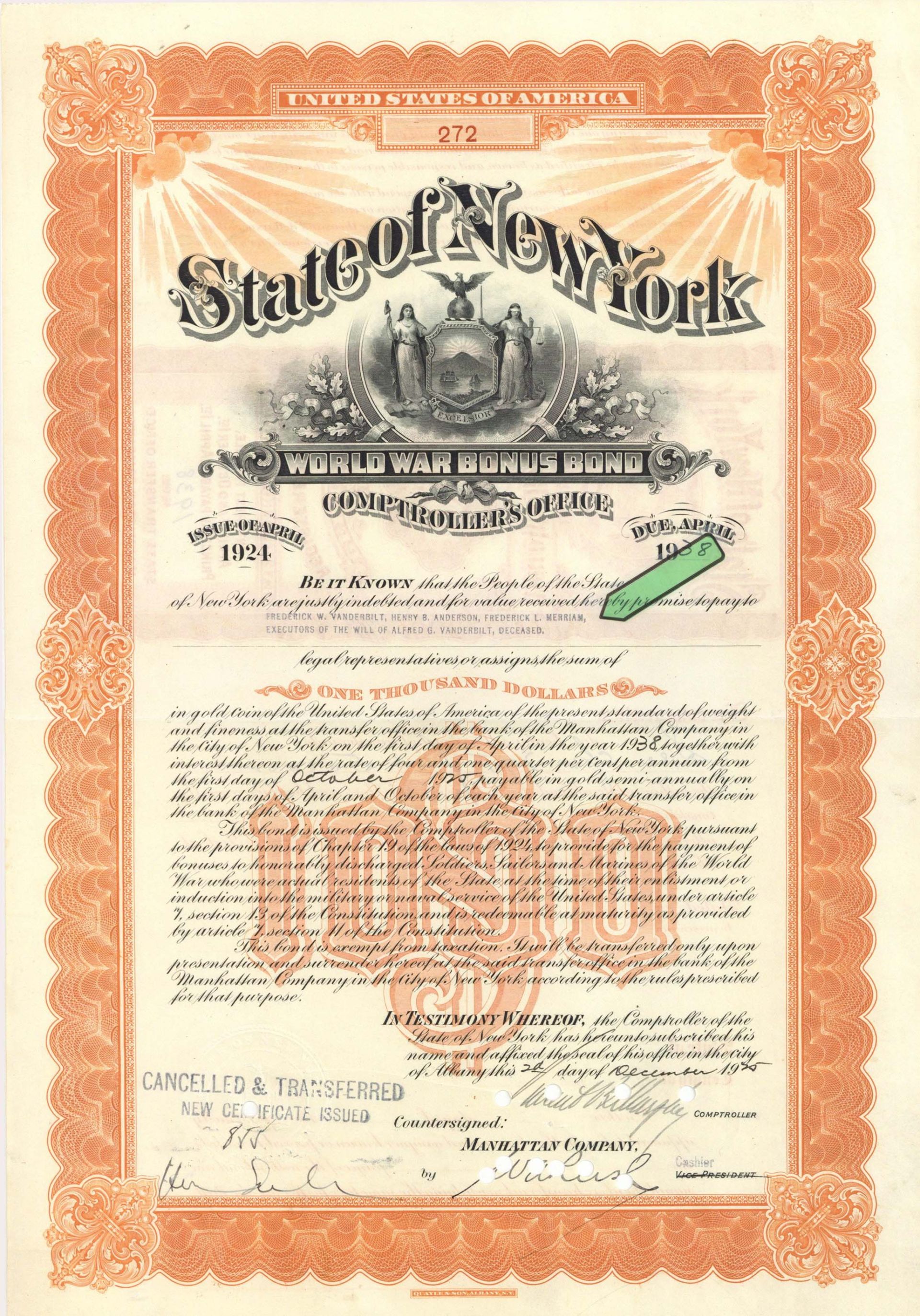 State of New York Issued to Frederick W. Vanderbilt - 1925 dated $1,000 General Bond