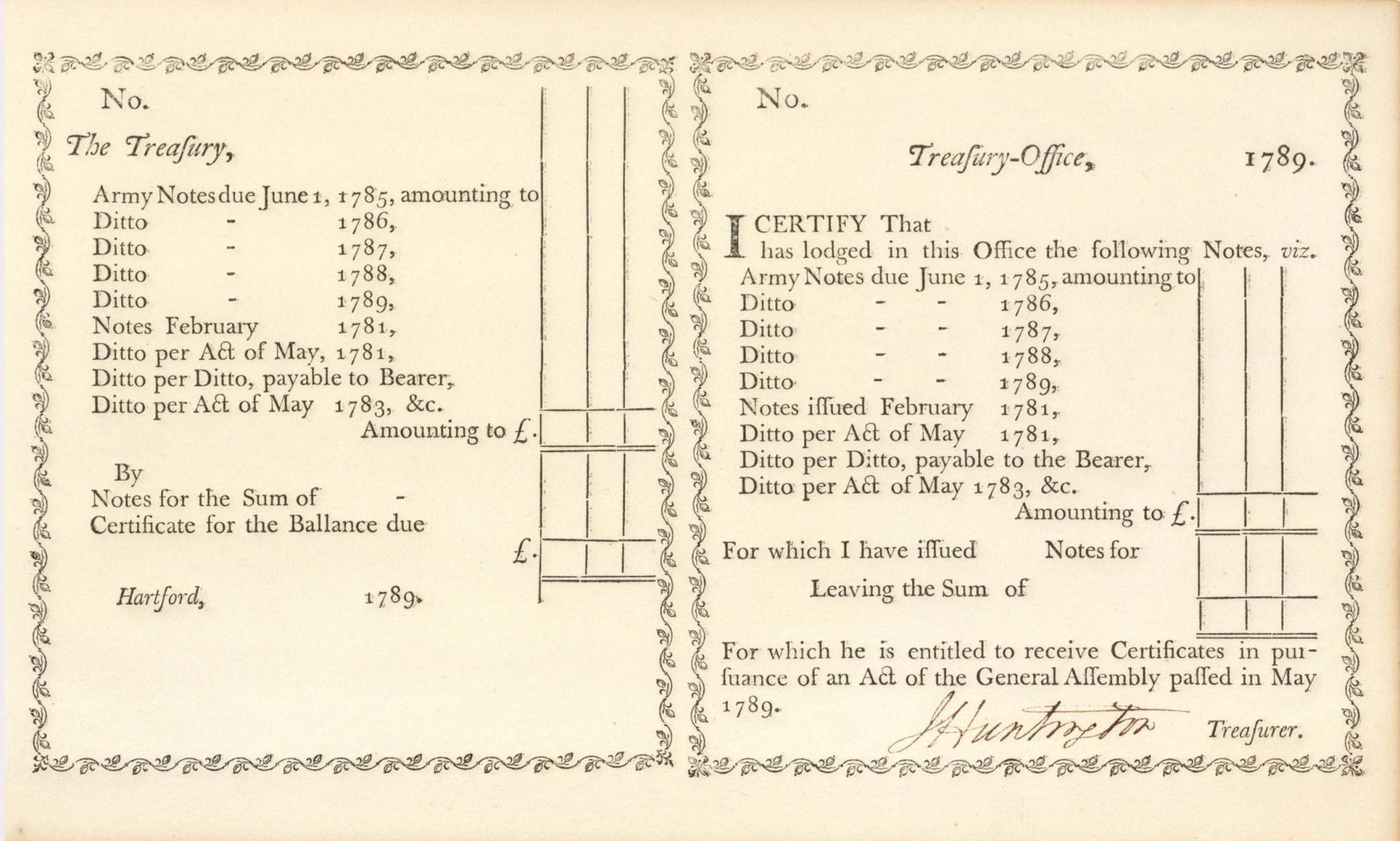 Jedediah Huntington signed Treasury Office Exchange of Notes - Connecticut - 1789 dated American Revolutionary War