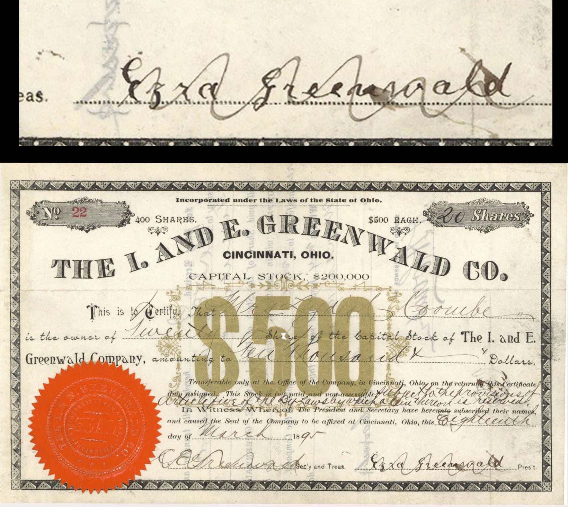 I. and E. Greenwald Co. Signed by Ezra Greenwald - 1895 dated Autographed Stocks and Bonds