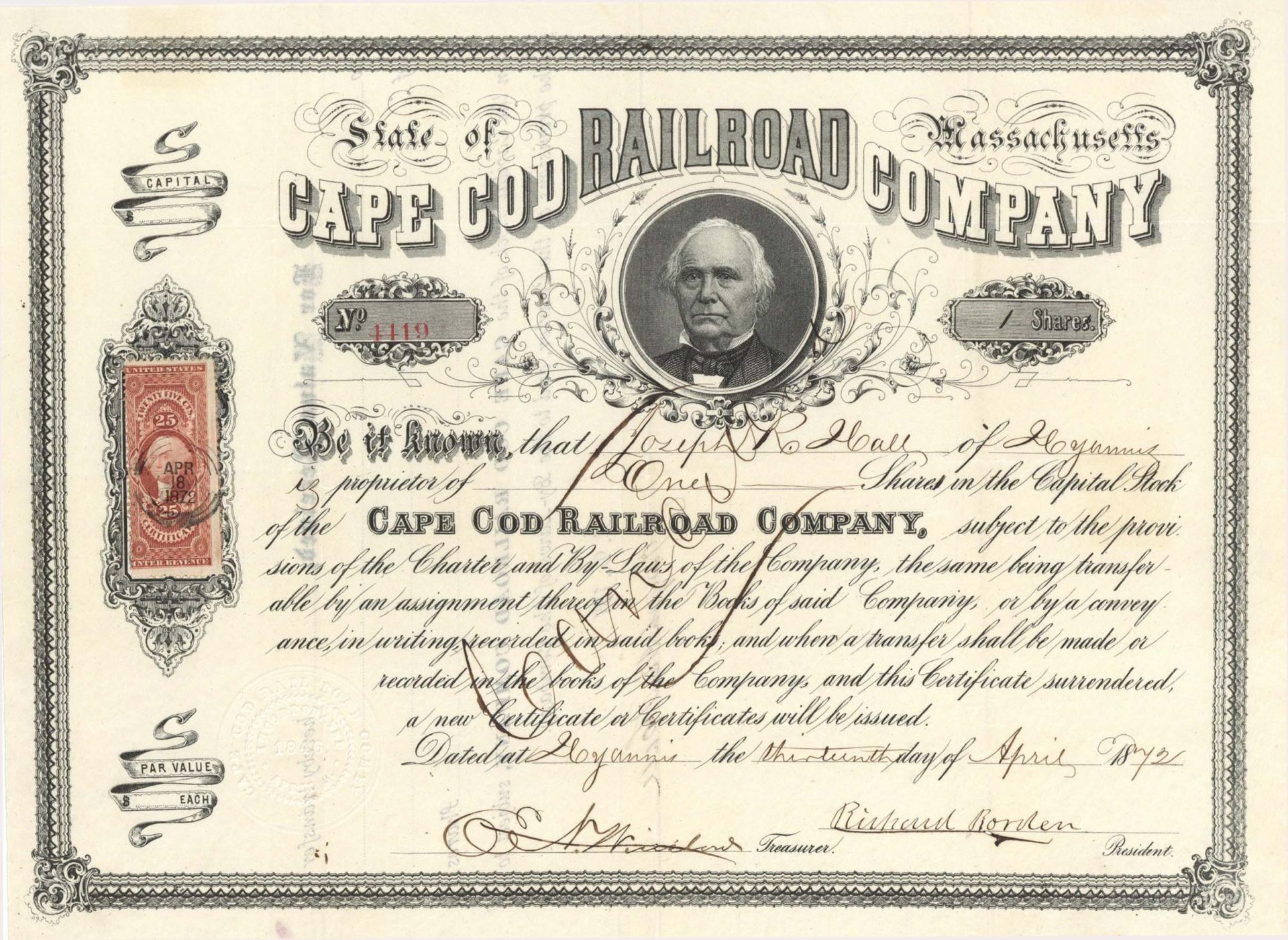 Cape Cod Railroad Co. Signed by Richard Borden - 1872 dated Autographed Stock Certificate