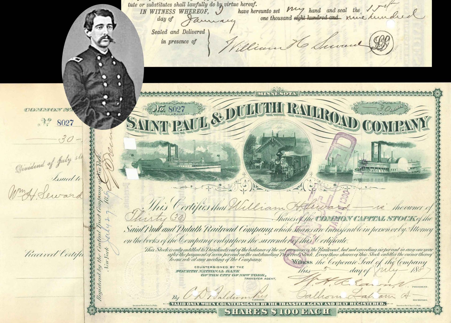Saint Paul and Duluth Railroad Co. Issued to and signed by William H. Seward - 1887 dated Autographed Stock Certificate