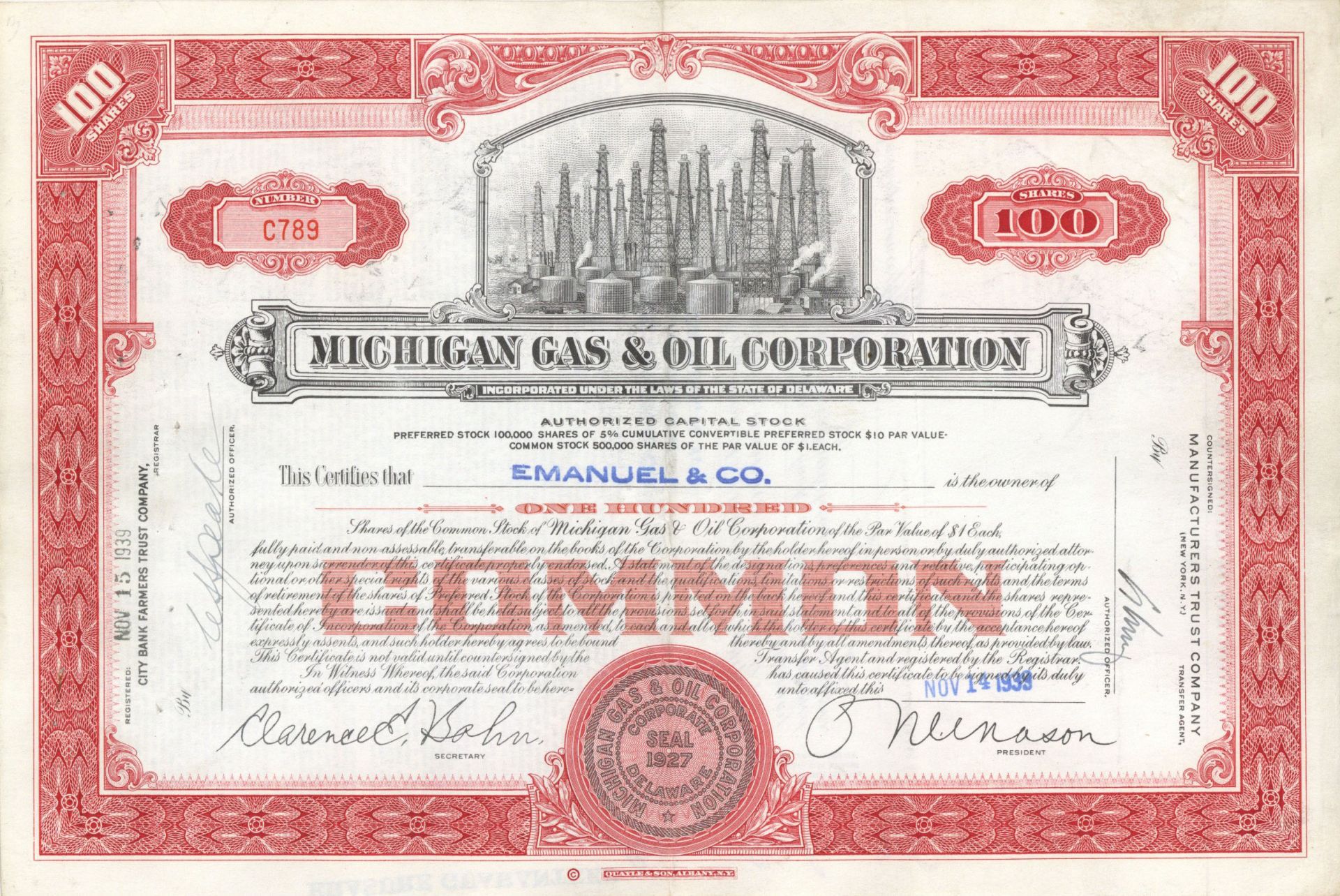 Michigan Gas and Oil Corp. - 1939 or 1940 dated Stock Certificate