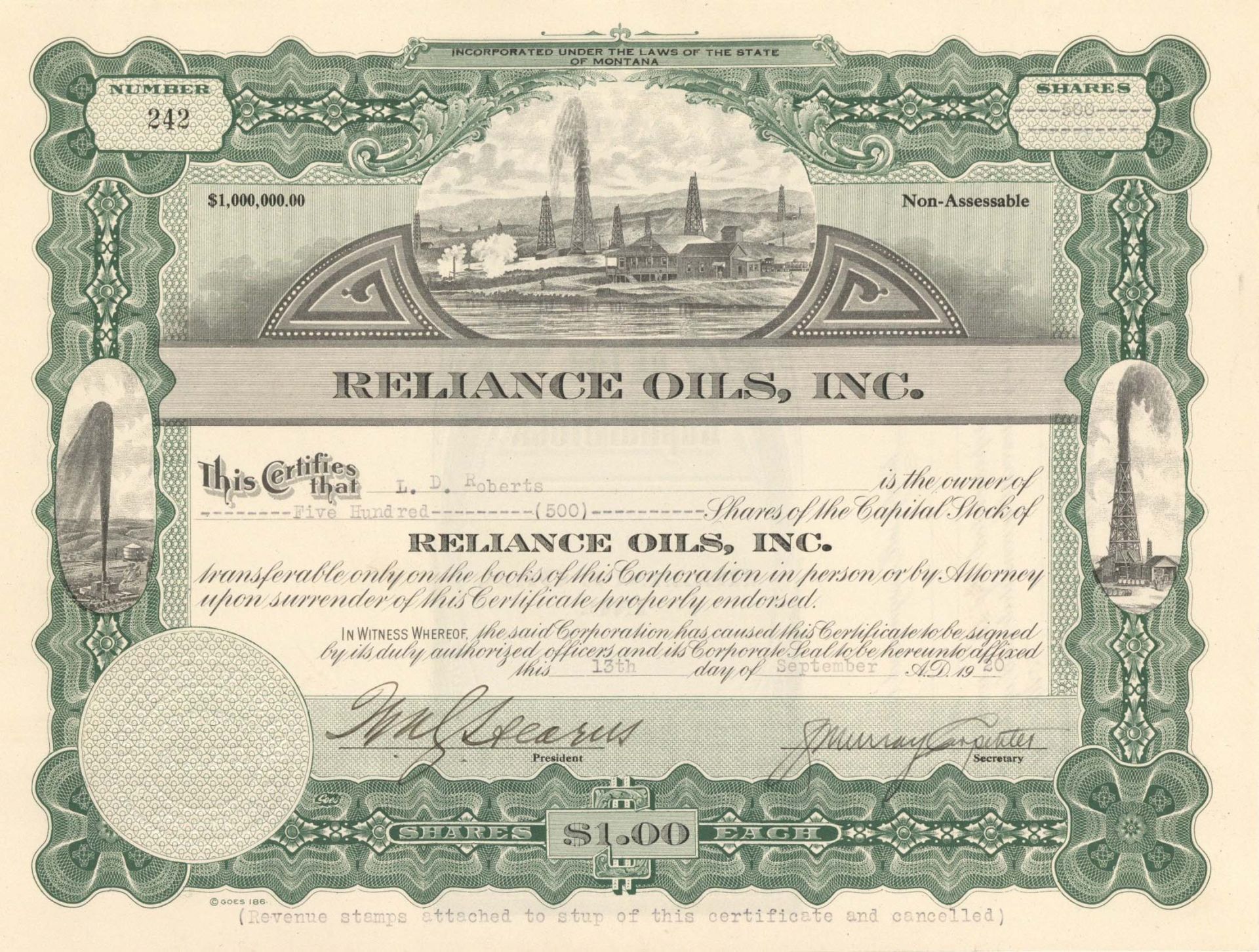 Reliance Oils, Inc. - 1920 dated Stock Certificate
