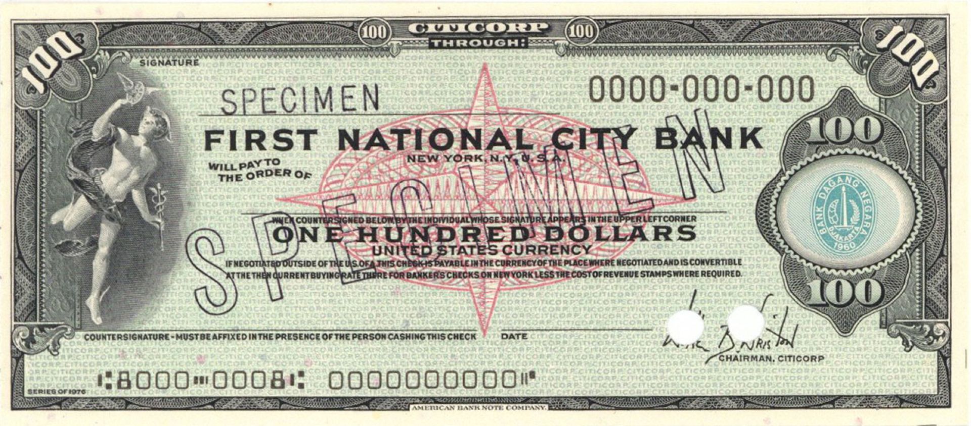 First National City Bank of New York - Later known as Citibank - Various Denominations - American Bank Note Company Specimen Check