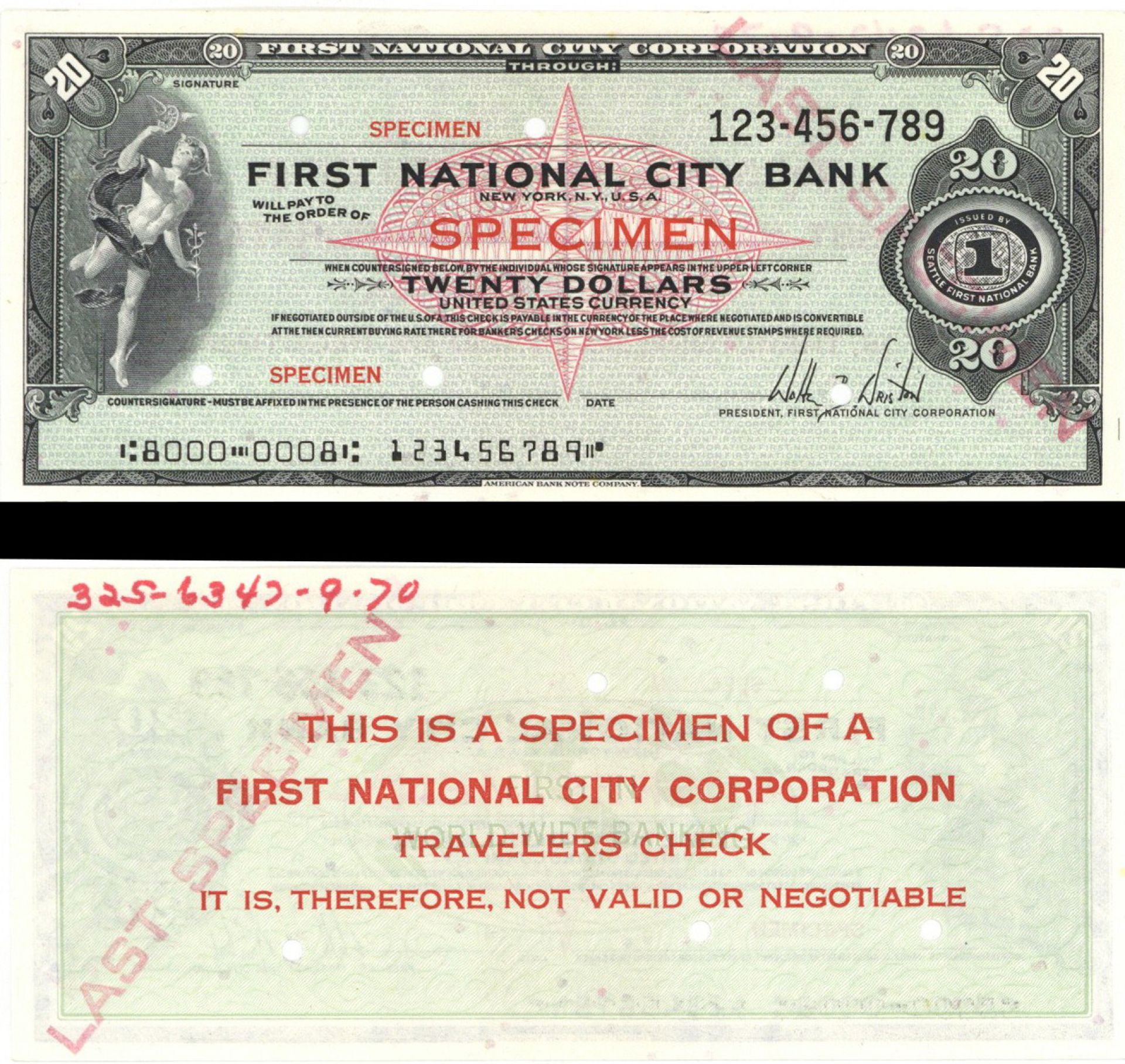 $20 Dollar - First National City Bank of New York - Later known as Citibank - American Bank Note Company Specimen Check