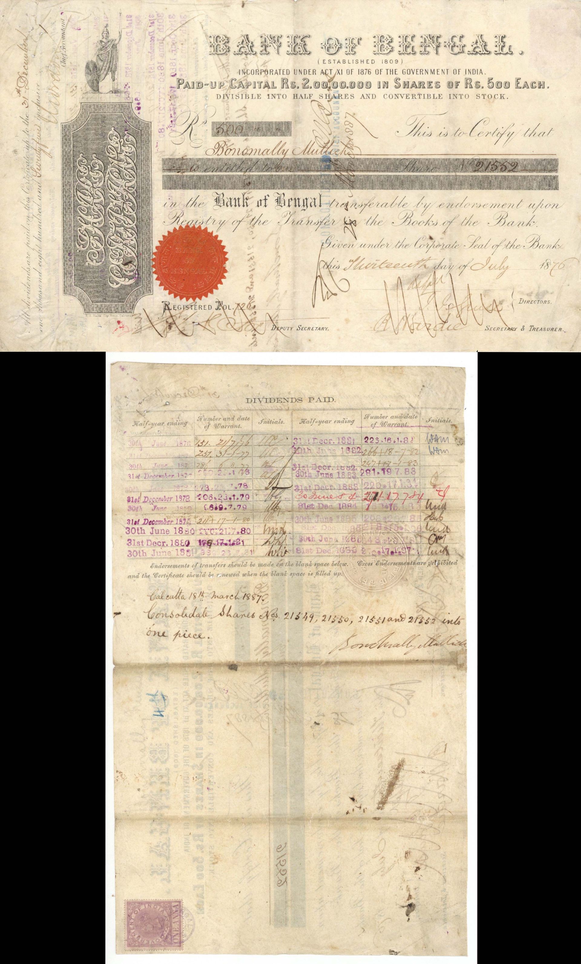 Bank of Bengal - 1876 dated Stock Certificate