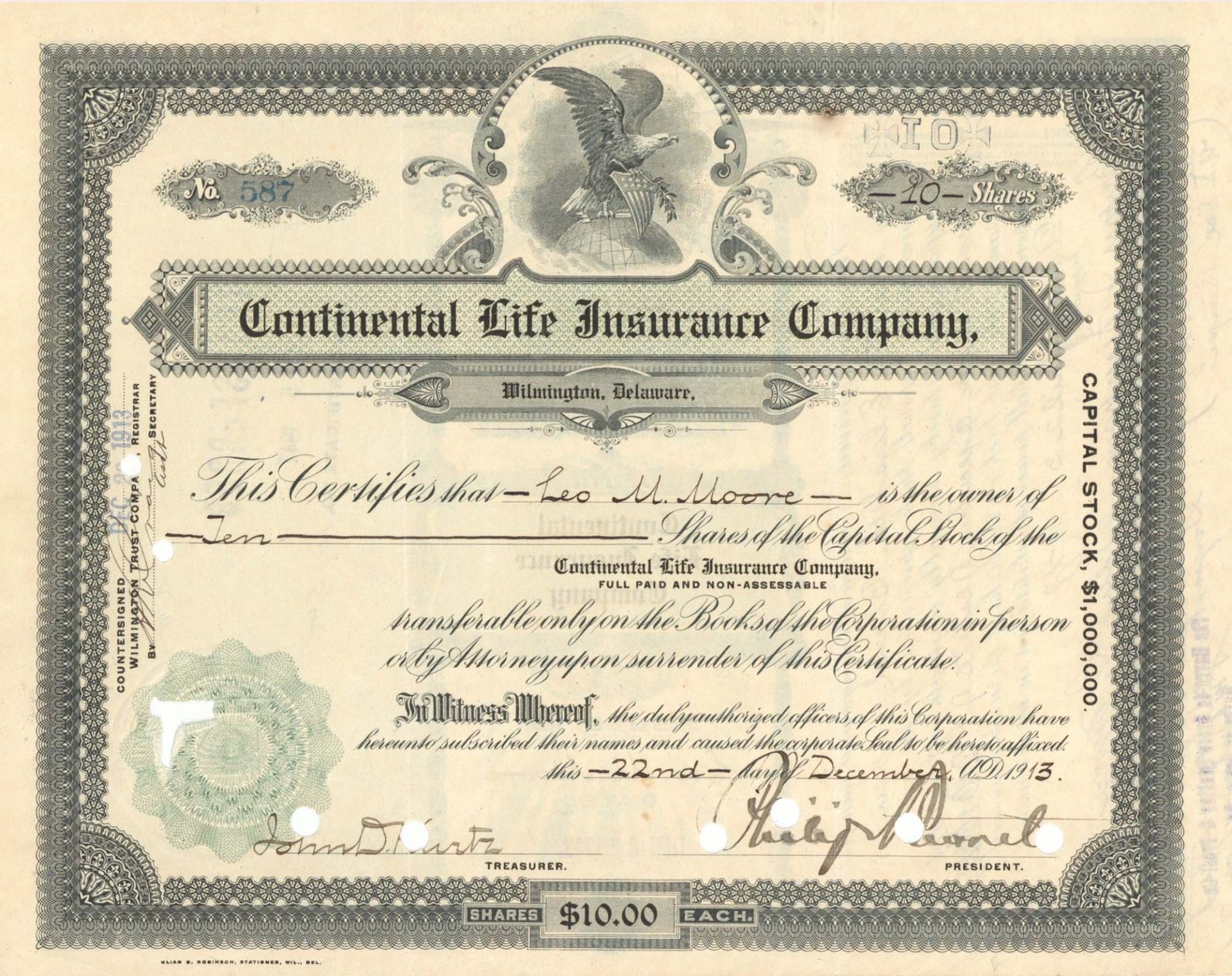 Continental Life Insurance Co. - 1913 dated Stock Certificate