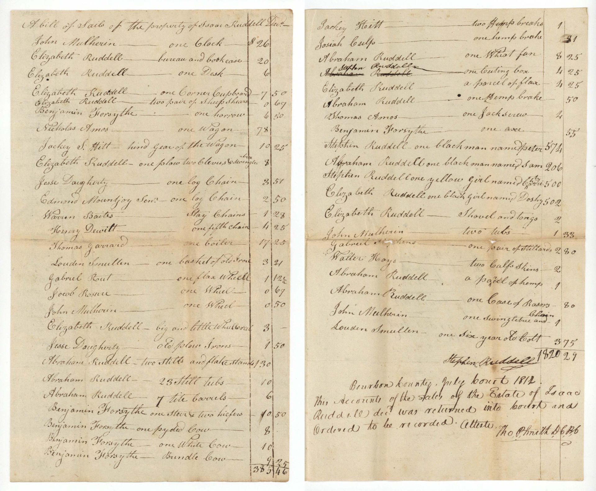 1812 dated Slavery Document - Bill of Sale of Property of Isaac Ruddell - Americana