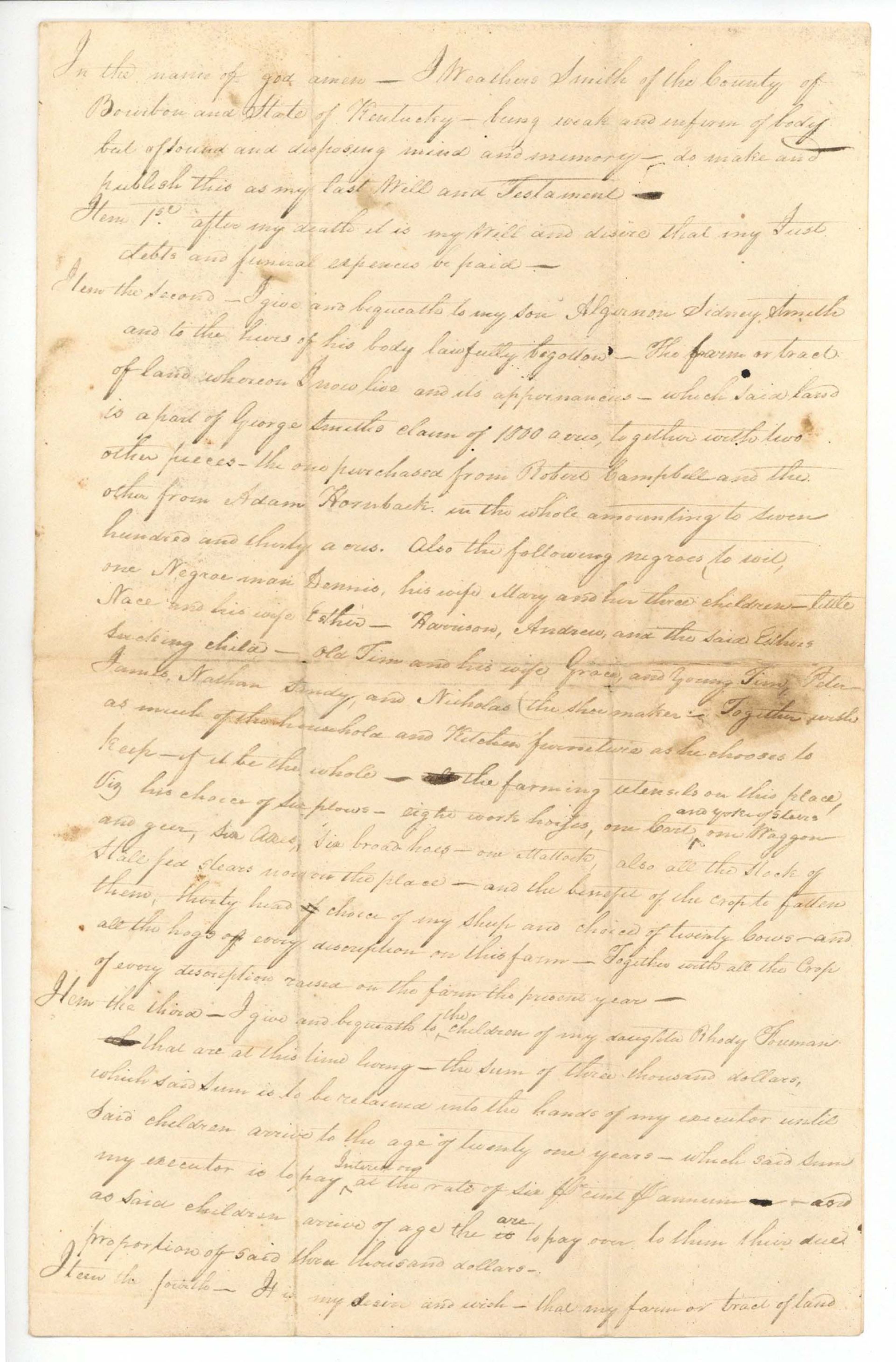 Inv# AM24793 page handwritten will of Weathers Smith which lists 18 slaves named. 1st page shown. Paper tear at fold therefore very fragile document.