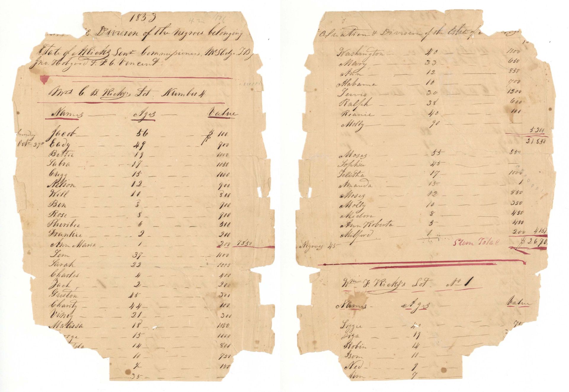 Handwritten Lists of 48 Slaves of C.B. Ricks - 1833 dated Slavery Documents from Abraham Ricks Archive