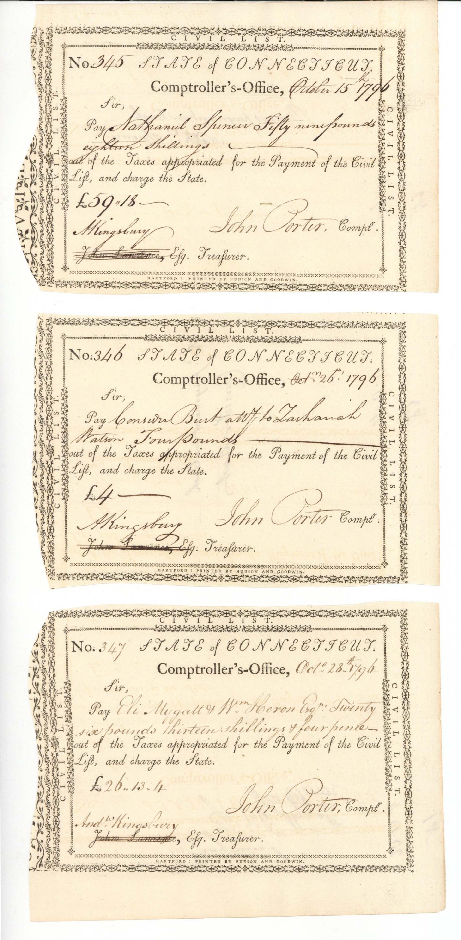 3 Payment Notes in numberical order dated 1796 - Connecticut Revolutionary War Bonds, etc.