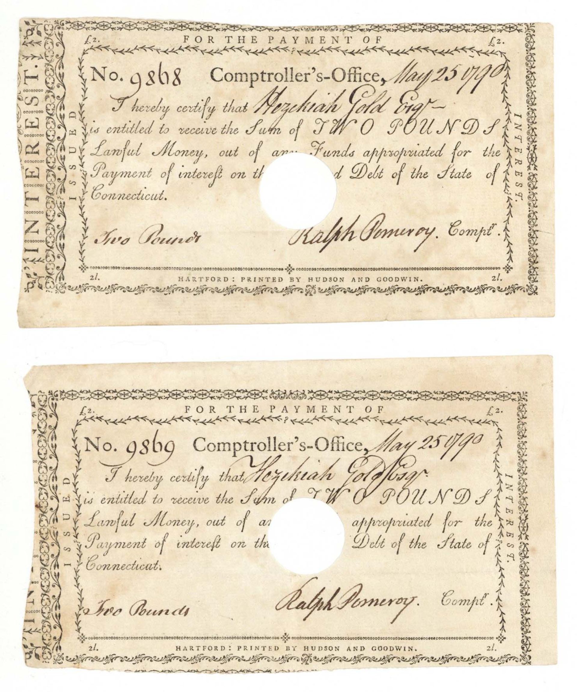 1790 dated Pair of Consecutive Serial Numbered Connecticut Line Notes - Connecticut - American Revolutionary War - Very Rare to Find