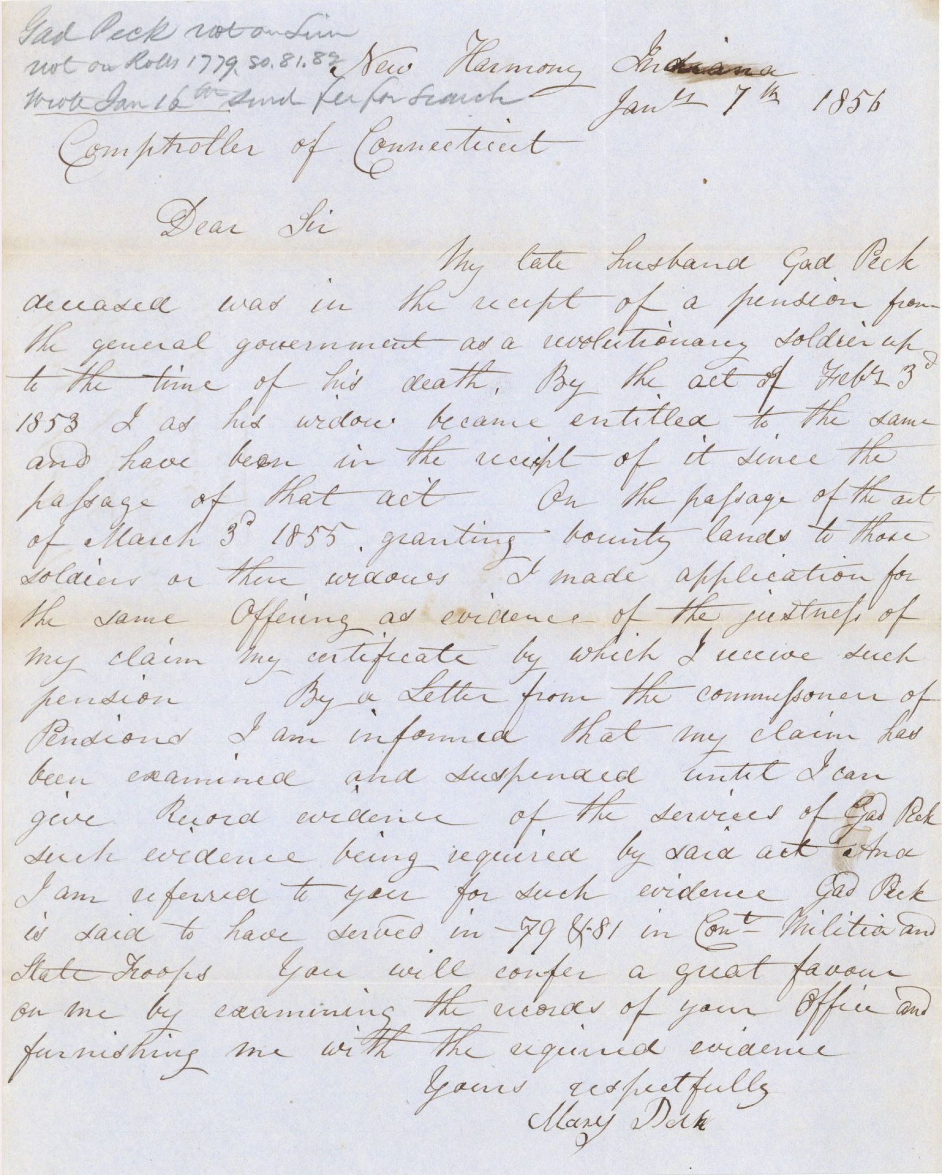 Letter regarding Revolutionary War Pension for Gad Peck sent by his wife.