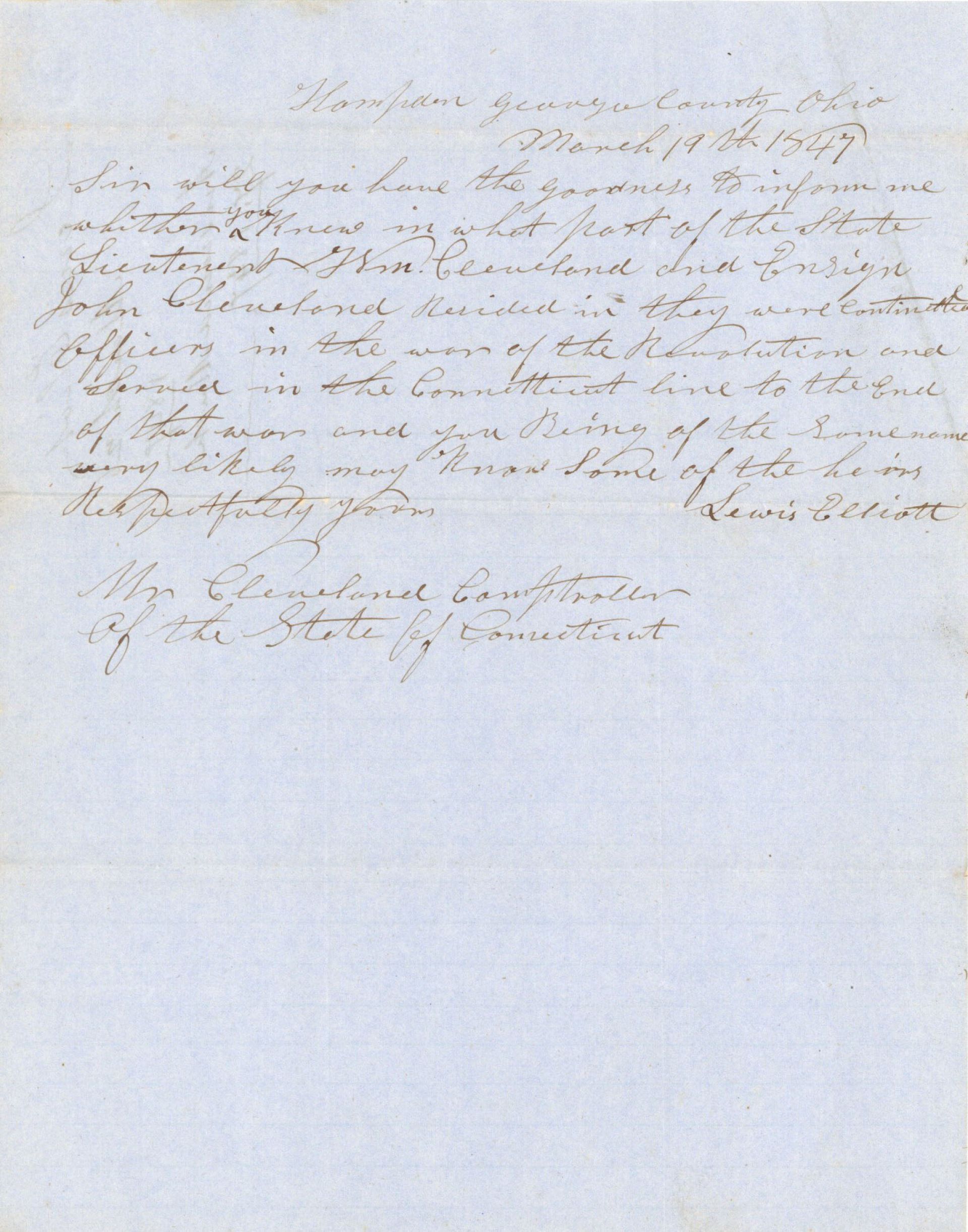 Letter regarding Revolutionary War Pension for Lieutenant Wm. Cleveland and Ensign John Cleveland.