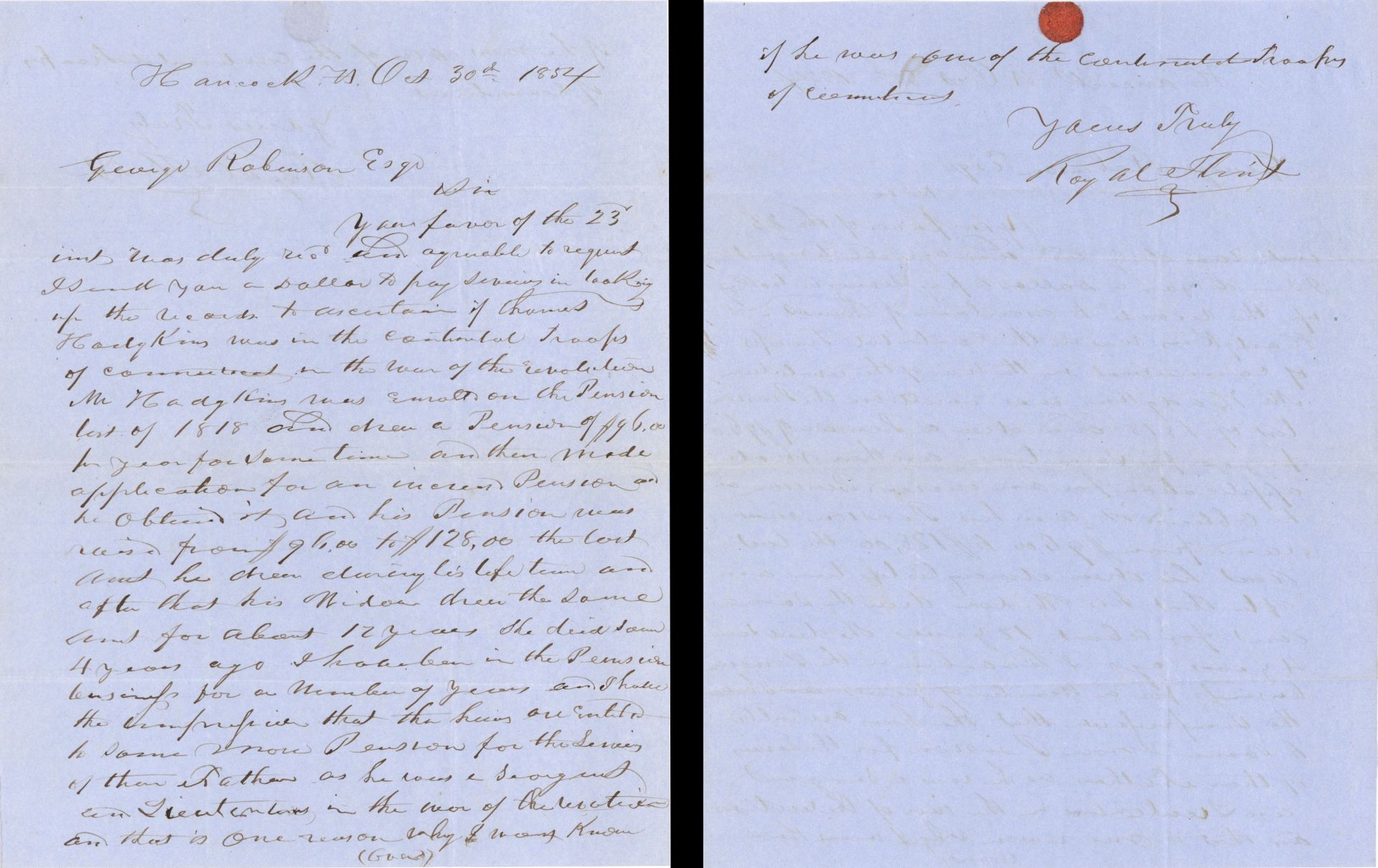 Revolutionary War Pension for Thomas Hodgkins - Connecticut - 1854 dated American Revolutionary War